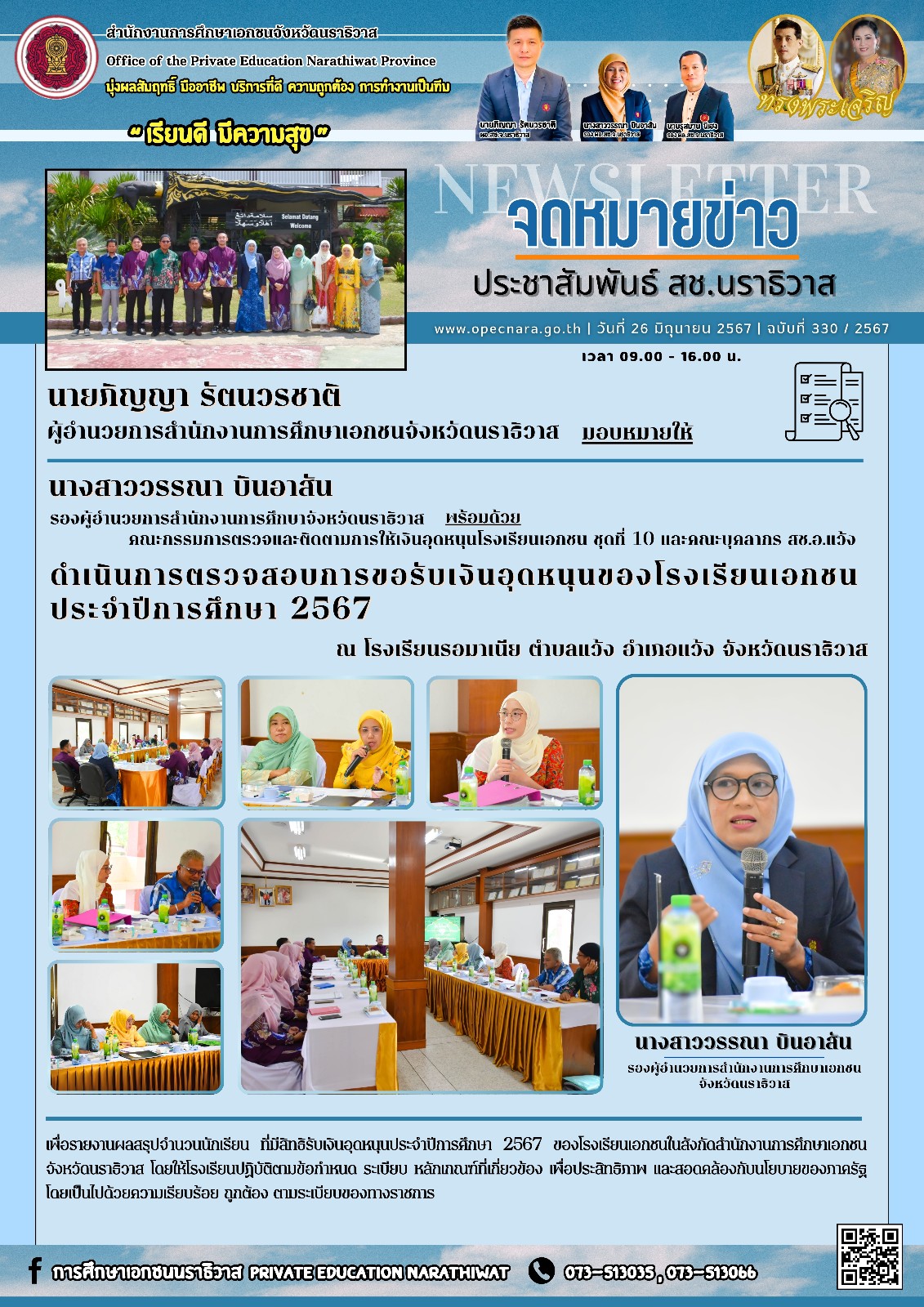 นายภิญญา รัตนวรชาติ ( ผู้อำนวยการสำนักงานการศึกษาจังหวัดนราธิวาส ) มอบหมายให้ นางสาววรรณ บินอาสัน ( รองผู้อำนวยการสำนักงานการศึกษาจังหวัดนราธิวาส ) พร้อมด้วย คณะกรรมการตรวจและติดตามการให้เงินอุดหนุนโรงเรียนเอกชน ชุดที่ 10 และคณะบุคลากร สช.อ.แว้ง ร่วมดำเนินการตรวจสอบการขอรับเงินอุดหนุนของโรงเรียนเอกชน ประจำปีการศึกษา 2567 ณ โรงเรียนรอมาเนีย ตำบลแว้ง อำเภอแว้ง จังหวัดนราธิวาส ทั้งนี้เพื่อรายงานผลสรุปจำนวนนักเรียน ที่มีสิทธิรับเงินอุดหนุนประจำปีการศึกษา 2567 ของโรงเรียนเอกชนในสังกัดสำนักงานการศึกษาเอกชนจังหวัดนราธิวาส โดยให้โรงเรียนปฏิบัติตามข้อกำหนด ระเบียบ หลักเกณฑ์ที่เกี่ยวข้อง เพื่อประสิทธิภาพ และสอดคล้องกับนโยบายของภาครัฐ โดยเป็นไปด้วยความเรียบร้อย ถูกต้อง ตามระเบียบของทางราชการ