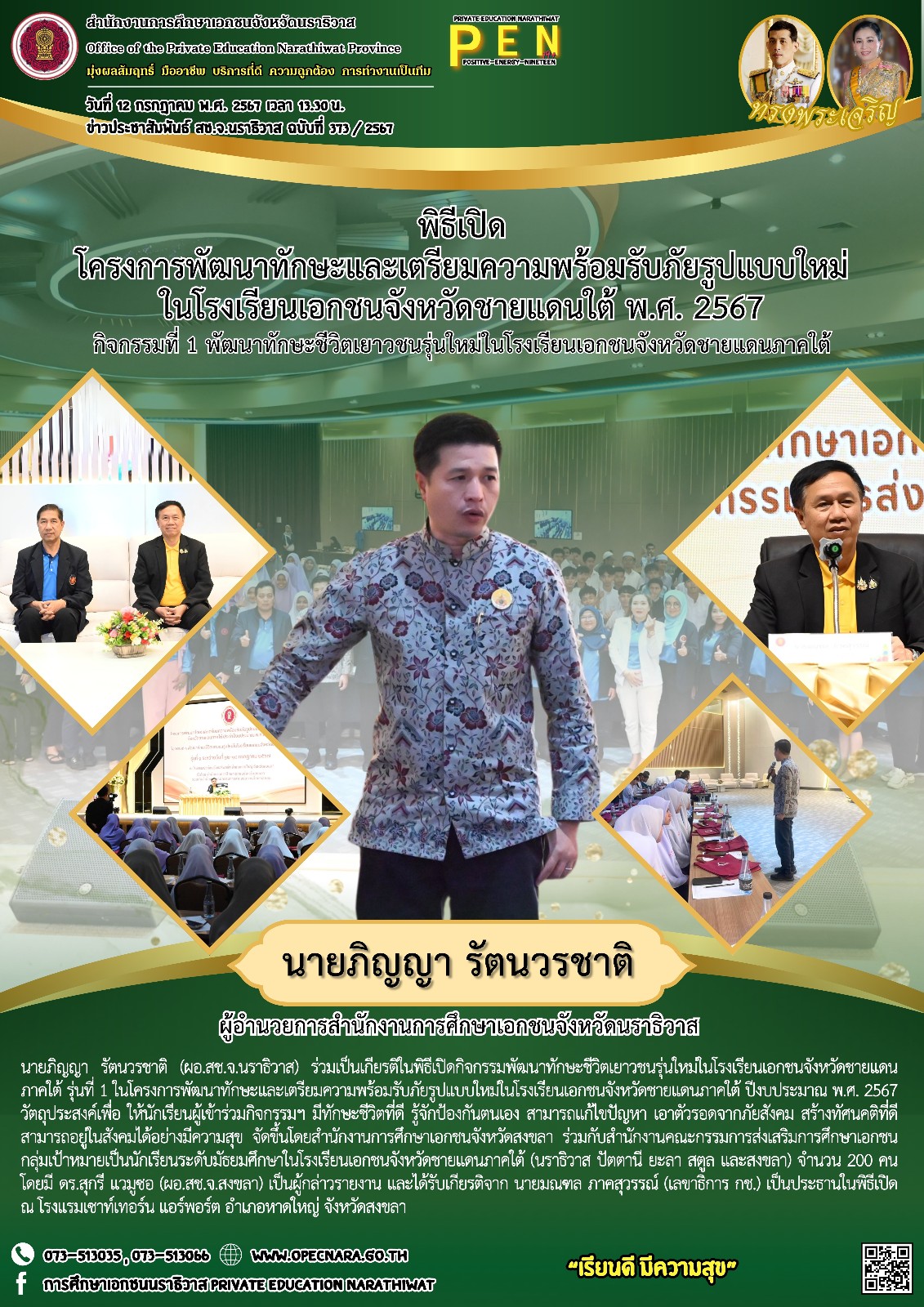 นายภิญญา รัตนวรชาติ (ผอ.สช.จ.นราธิวาส) ร่วมเป็นเกียรติในพิธีเปิดกิจกรรมพัฒนาทักษะชีวิตเยาวชนรุ่นใหม่ในโรงเรียนเอกชนจังหวัดชายแดนภาคใต้ รุ่นที่ 1 ในโครงการพัฒนาทักษะและเตรียมความพร้อมรับภัยรูปแบบใหม่ในโรงเรียนเอกชนจังหวัดชายแดนภาคใต้ ปีงบประมาณ พ.ศ. 2567 วัตถุประสงค์เพื่อ ให้นักเรียนผู้เข้าร่วมกิจกรรมฯ มีทักษะชีวิตที่ดี รู้จักป้องกันตนเอง สามารถแก้ไขปัญหา เอาตัวรอดจากภัยสังคม สร้างทัศนคติที่ดี สามารถอยู่ในสังคมได้อย่างมีความสุข จัดขึ้นโดยสำนักงานการศึกษาเอกชนจังหวัดสงขลา ร่วมกับสำนักงานคณะกรรมการส่งเสริมการศึกษาเอกชน กลุ่มเป้าหมายเป็นนักเรียนระดับมัธยมศึกษาในโรงเรียนเอกชนจังหวัดชายแดนภาคใต้ (นราธิวาส ปัตตานี ยะลา สตูล และสงขลา) จำนวน 200 คน โดยมี ดร.สุกรี แวมูซอ (ผอ.สช.จ.สงขลา) เป็นผู้กล่าวรายงาน และได้รับเกียรติจาก นายมณฑล ภาคสุวรรณ์ (เลขาธิการ กช.) เป็นประธานในพิธีเปิด ณ โรงแรมเซาท์เทอร์น แอร์พอร์ต อำเภอหาดใหญ่ จังหวัดสงขลา