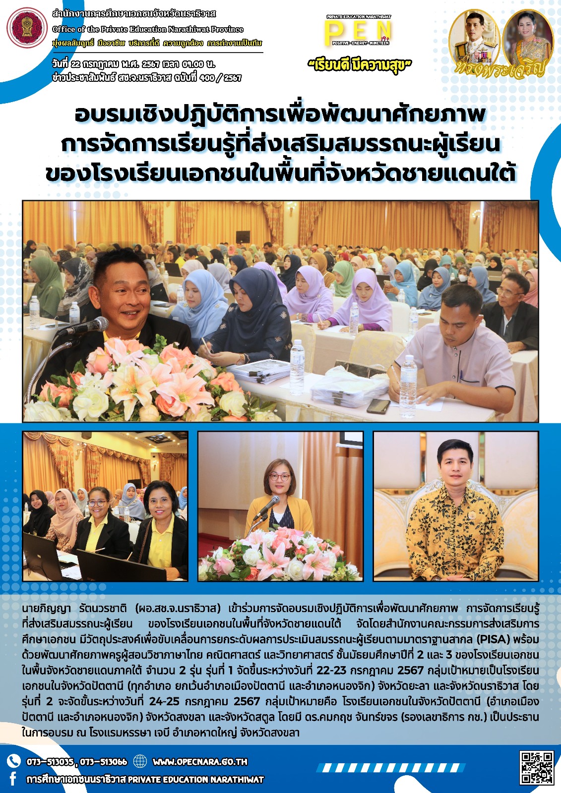 นายภิญญา รัตนวรชาติ (ผอ.สช.จ.นราธิวาส) เข้าร่วมการจัดอบรมเชิงปฏิบัติการเพื่อพัฒนาศักยภาพ การจัดการเรียนรู้ ที่ส่งเสริมสมรรถนะผู้เรียน ของโรงเรียนเอกชนในพื้นที่จังหวัดชายแดนใต้ จัดโดยสำนักงานคณะกรรมการส่งเสริมการศึกษาเอกชน มีวัตถุประสงค์เพื่อขับเคลื่อนการยกระดับผลการประเมินสมรรถนะผู้เรียนตามมาตราฐานสากล (PISA) พร้อมด้วยพัฒนาศักยภาพครูผู้สอนวิชาภาษาไทย คณิตศาสตร์ และวิทยาศาสตร์ ชั้นมัธยมศึกษาปีที่ 2 และ 3 ของโรงเรียนเอกชนในพื้นจังหวัดชายแดนภาคใต้ จำนวน 2 รุ่น รุ่นที่ 1 จัดขึ้นระหว่างวันที่ 22-23 กรกฎาคม 2567 กลุ่มเป้าหมายเป็นโรงเรียนเอกชนในจังหวัดปัตตานี (ทุกอำเภอ ยกเว้นอำเภอเมืองปัตตานี และอำเภอหนองจิก) จังหวัดยะลา และจังหวัดนราธิวาส โดยรุ่นที่ 2 จะจัดขั้นระหว่างวันที่ 24-25 กรกฎาคม 2567 กลุ่มเป้าหมายคือ โรงเรียนเอกชนในจังหวัดปัตตานี (อำเภอเมืองปัตตานี และอำเภอหนองจิก) จังหวัดสงขลา และจังหวัดสตูล โดยมี ดร.คมกฤช จันทร์ขจร (รองเลขาธิการ กช.) เป็นประธานในการอบรม ณ โรงแรมหรรษา เจบี อำเภอหาดใหญ่ จังหวัดสงขลา