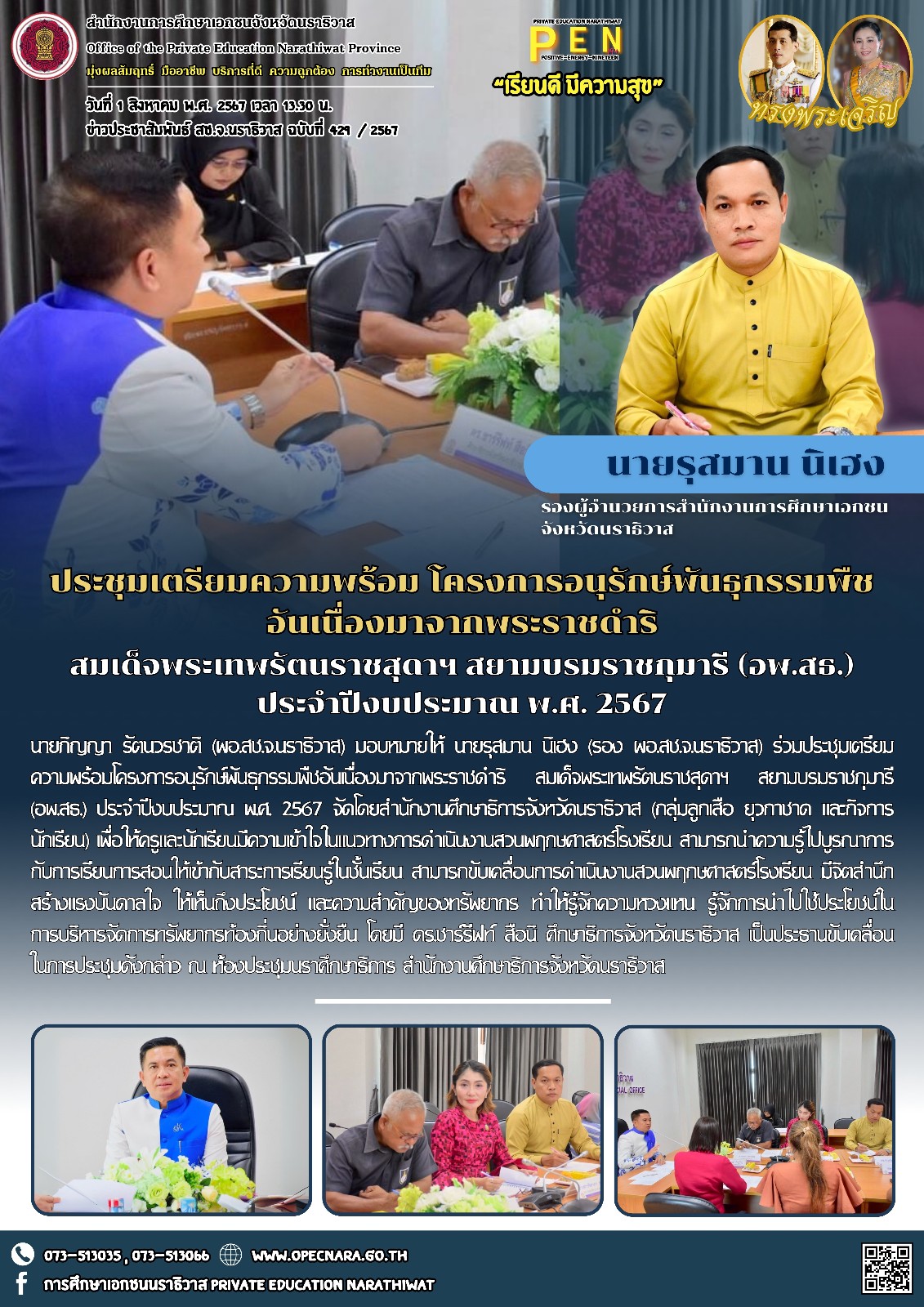 นายภิญญา รัตนวรชาติ (ผอ.สช.จ.นราธิวาส) มอบหมายให้ นายรุสมาน นิเฮง (รอง ผอ.สช.จ.นราธิวาส) ร่วมประชุมเตรียมความพร้อมโครงการอนุรักษ์พันธุกรรมพืชอันเนื่องมาจากพระราชดำริ สมเด็จพระเทพรัตนราชสุดาฯ สยามบรมราชกุมารี (อพ.สธ.) ประจำปีงบประมาณ พ.ศ. 2567 จัดโดยสำนักงานศึกษาธิการจังหวัดนราธิวาส (กลุ่มลูกเสือ ยุวกาชาด และกิจการนักเรียน) เพื่อให้ครูและนักเรียนมีความเข้าใจในแนวทางการดำเนินงานสวนพฤกษศาสตร์โรงเรียน สามารถนำความรู้ไปบูรณาการกับการเรียนการสอนให้เข้ากับสาระการเรียนรู้ในชั้นเรียน สามารถขับเคลื่อนการดำเนินงานสวนพฤกษศาสตร์โรงเรียน มีจิตสำนึก สร้างแรงบันดาลใจ ให้เห็นถึงประโยชน์ และความสำคัญของทรัพยากร ทำให้รู้จักความหวงแหน รู้จักการนำไปใช้ประโยชน์ในการบริหารจัดการทรัพยากรท้องถิ่นอย่างยั่งยืน โดยมี ดร.ชาร์รีฟท์ สือนิ ศึกษาธิการจังหวัดนราธิวาส เป็นประธานขับเคลื่อนในการประชุมดังกล่าว ณ ห้องประชุมนราศึกษาธิการ สำนักงานศึกษาธิการจังหวัดนราธิวาส