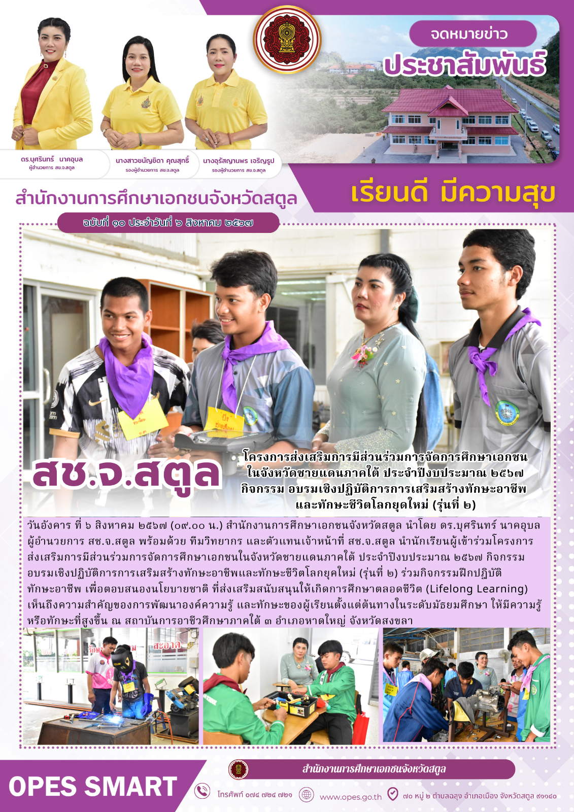 วันอังคาร ที่ ๖ สิงหาคม ๒๕๖๗ (๐๙.๐๐ น.) สำนักงานการศึกษาเอกชนจังหวัดสตูล นำโดย ดร.บุศรินทร์ นาคอุบล ผู้อำนวยการ สช.จ.สตูล พร้อมด้วย ทีมวิทยากร และตัวแทนเจ้าหน้าที่ สช.จ.สตูล นำนักเรียนผู้เข้าร่วมโครงการส่งเสริมการมีส่วนร่วมการจัดการศึกษาเอกชนในจังหวัดชายแดนภาคใต้ ประจำปีงบประมาณ ๒๕๖๗ กิจกรรม อบรมเชิงปฏิบัติการการเสริมสร้างทักษะอาชีพและทักษะชีวิตโลกยุคใหม่ (รุ่นที่ ๒) ร่วมกิจกรรมฝึกปฎิบัติทักษะอาชีพ เพื่อตอบสนองนโยบายชาติ ที่ส่งเสริมสนับสนุนให้เกิดการศึกษาตลอดชีวิต (Lifelong Learning) เห็นถึงความสำคัญของการพัฒนาองค์ความรู้ และทักษะของผู้เรียนตั้งแต่ต้นทางในระดับมัธยมศึกษา ให้มีความรู้หรือทักษะที่สูงขึ้น ณ สถาบันการอาชีวศึกษาภาคใต้ ๓ อำเภอหาดใหญ่ จังหวัดสงขลา