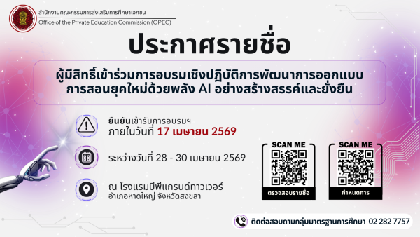 ประกาศรายชื่อผู้มีสิทธิ์เข้าร่วมการอบรมเชิงปฏิบัติการพัฒนาการออกแบบการสอนยุคใหม่ด้วยพลัง AI อย่างสร้างสรรค์และยั่งยืน