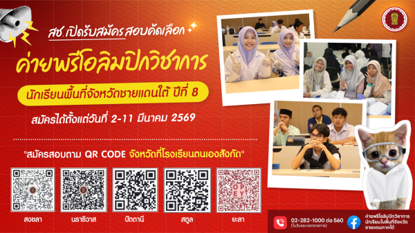 สช.เปิดรับสมัครสอบคัดเลือกเข้าค่ายพรีโอลิมปิกวิชาการ นักเรียนในพื้นที่จังหวัดชายแดนใต้ ปีที่ 8 ปีงบประมาณ พ.ศ. 2569 ระหว...