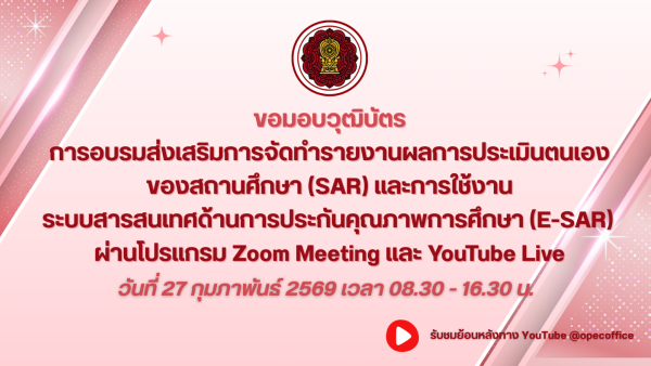 ขอมอบวุฒิบัตรการอบรมส่งเสริมการจัดทำรายงานผลการประเมินตนเองของสถานศึกษา (SAR) และการใช้งานระบบสารสนเทศด้านการประกันคุณภา...