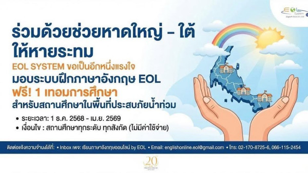 ขอเชิญสถานศึกษา เข้าใช้งานระบบ EOL SYSTEM ฟรี! ไม่มีค่าใช้จ่าย เพื่อเพิ่มพูนทักษะด้านภาษาอังกฤษ ภายใต้โครงการ “ช่วยหาดให...