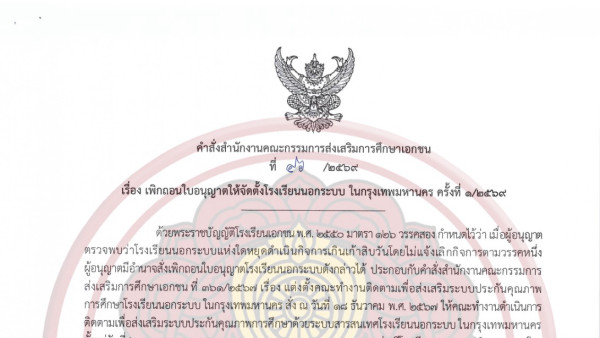 สช. มีคำสั่งเพิกถอนใบอนุญาตให้จัดตั้งโรงเรียนนอกระบบ ในกรุงเทพมหานคร ครั้งที่ 1/2569