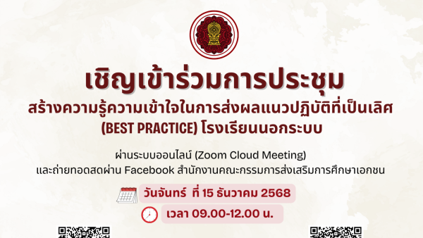 จึงขอเรียนเชิญเข้าร่วมประชุม สร้างความรู้ความเข้าใจในการจัดทำแผนพัฒนาการจัดการศึกษาและแผนปฏิบัติการของโรงเรียนนอกระบบ ในวันอังคาร ที่ 18 มีนาคม พ.ศ. 2568 เวลา 09.00-12.00 น. ผ่านระบบออนไลน์ (Zoom Cloud Meeting) โดยไม่มีค่าใช้จ่ายที่ Meeting ID: 897 5778 8772 (Passcode: 011058) และ Meeting ID: 669 001 1212 (ไม่มี password) โดยสามารถกรอกแบบตอบรับการเข้าร่วมประชุมผ่านระบบออนไลน์ ภายในวันศุกร์ ที่ 14 มีนาคม พ.ศ. 2568 สำหรับผู้เข้าร่วมประชุมจะได้รับเกียรติบัตร รายละเอียดดังเอกสารแนบด้านล่าง