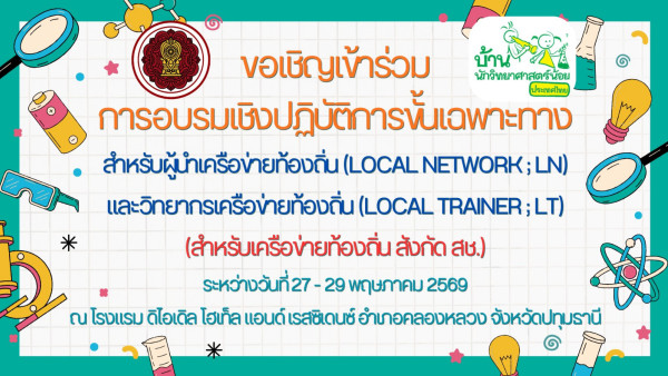 ขอเชิญเข้าร่วมการอบรมเชิงปฏิบัติการขั้นเฉพาะทางสำหรับผู้นำเครือข่ายท้องถิ่น (Local Network ; LN) และวิทยากรเครือข่ายท้อง...