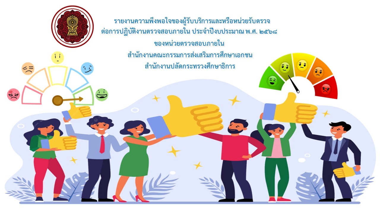 หน่วยตรวจสอบภายใน สำนักงานคณะกรรมการส่งเสริมการศึกษาเอกชน ได้จัดทำรายงานความพึงพอใจของผู้รับบริการและหรือหน่วยรับตรวจ ต่อการปฏิบัติงานตรวจสอบภายใน ประจำปีงบประมาณ พ.ศ. 2568 เสร็จเรียบร้อยแล้ว ท่านที่สนใจสามารถดาวน์โหลดอ่านเอกสารได้ที่ลิงก์ด้านล่าง