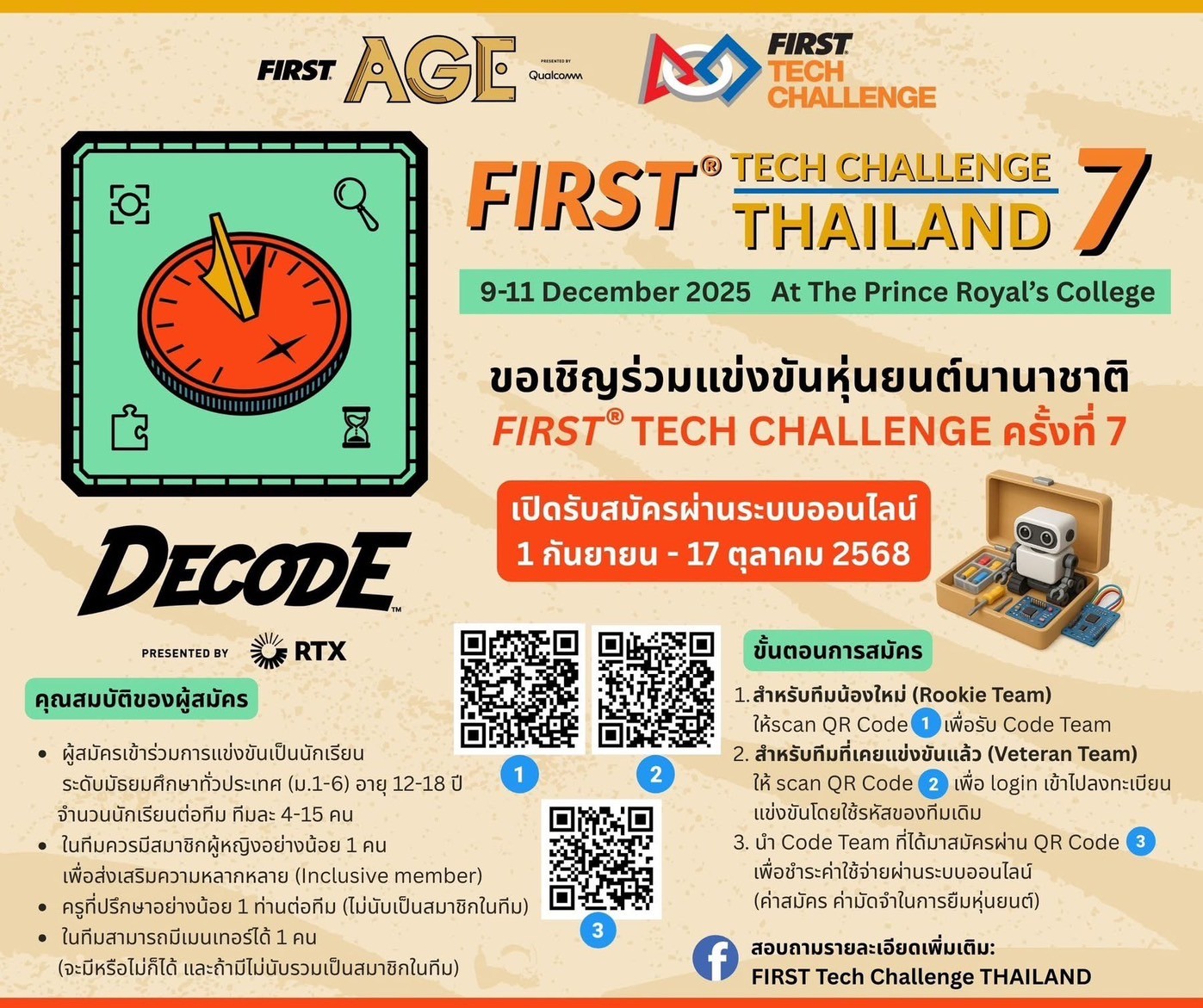 ด้วยโรงเรียนปรินส์รอยแยลส์วิทยาลัย อำเภอเมืองเชียงใหม่ จังหวัดเชียงใหม่ ร่วมกับคณะวิศวกรรมศาสตร์ มหาวิทยาลัยเชียงใหม่ และการไฟฟ้าฝ่ายผลิตแห่งประเทศไทย กำหนดจัดการแข่งขันหุ่นยนต์ระดับเยาวชน FIRST® Tech Challenge Thailand ครั้งที่ 7 ในหัวข้อ “DECODETM presented by RTX” ชิงถ้วยพระราชทาน จากสมเด็จพระกนิษฐาธิราชเจ้า กรมสมเด็จพระเทพรัตนราชสุดา ฯ สยามบรมราชกุมารี ระหว่างวันที่ 9 – 11 ธันวาคม 2568 ณ อาคาร 100 ปี สถาบันแฮรีส โรงเรียนปรินส์รอยแยลส์วิทยาลัย จังหวัดเชียงใหม่
