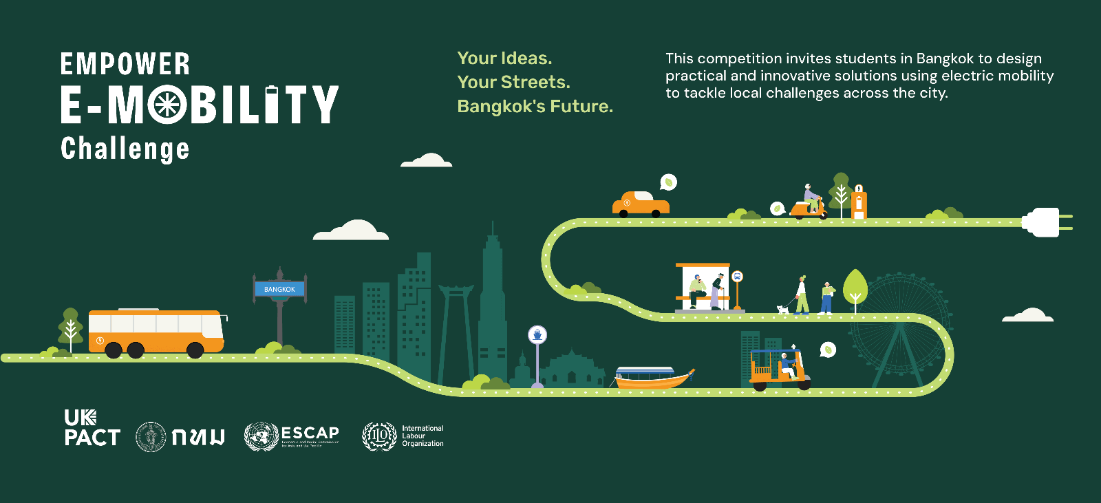คณะกรรมาธิการเศรษฐกิจและสังคมแห่งสหประชาชาติประจำเอเชียและแปซิฟิค หรือ ESCAP องค์การแรงงานระหว่างประเทศ และกรุงเทพมหานคร ขอเชิญชวนนักเรียน นักศึกษาที่กำลังศึกษาอยู่ในระดับมัธยมศึกษา อาชีวศึกษา หรือมหาวิทยาลัย ภายในพื้นที่กรุงเทพมหานครและปริมณฑล มาร่วมกันออกแบบแนวทางพัฒนาการคมนาคมแห่งอนาคตของกรุงเทพฯ กับกิจกรรมการแข่งขันเยาวชนเพื่อการขับเคลื่อนด้วยพลังงานไฟฟ้า “Empower E-Mobility Challenge”