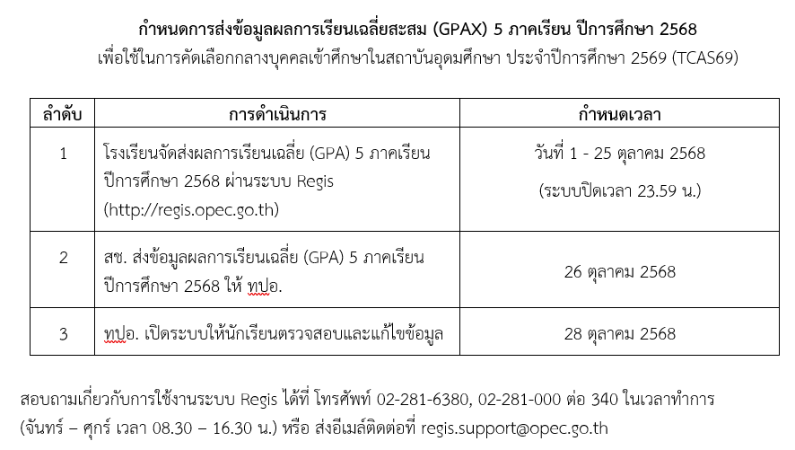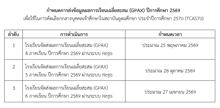 โดยในปีการศึกษา 2568 ระบบจะเปิดให้ส่งข้อมูล ระหว่างวันที่ 1 - 25 ตุลาคม 2568 (ระบบปิดเวลา 23.59 น.) ดังนั้น เพื่อไม่ให้ส่งผลกระทบต่อนักเรียนที่สมัครคัดเลือกเข้าศึกษาในสถาบันอุดมศึกษา ขอให้โรงเรียนจัดส่งข้อมูลผลการเรียนเฉลี่ยสะสม (GPAX) 5 ภาคเรียน ของผู้สำเร็จการศึกษาชั้นมัธยมศึกษาปีที่ 6 ปีการศึกษา 2568 ภายในระยะเวลาที่กำหนด ทั้งนี้ การส่งข้อมูลผลการเรียนเฉลี่ยสะสม (GPAX) เพื่อใช้ในการคัดเลือกกลางบุคคลเข้าศึกษาในสถาบันอุดมศึกษา ประจำปีการศึกษา 2570 (TCAS70) ขอให้โรงเรียนดำเนินการตามกำหนดการที่แนบนี้