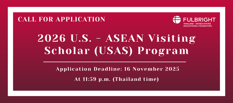 ขอแจ้งประชาสัมพันธ์การเปิดรับสมัครทุนวิจัยฟุลไบรท์ภายใต้โครงการ Fulbright U.S.-ASEAN Visiting Scholar (USAS) Program สำหรับผู้ถือสัญชาติไทย โดยรับสมัครอาจารย์และนักวิจัยมหาวิทยาลัย บุคลากรจากภาครัฐและเอกชน สถาบันคิดเชิงนวัตกรรมและองค์กรที่ไม่แสวงหาผลกำไร เพื่อเสนอชื่อผู้ผ่านการคัดเลือกขั้นต้น จำนวนไม่เกิน 4 คน เข้าแข่งขันกับผู้สมัครจากภูมิภาคอาเซียนในประเทศสมาชิกทั้ง 10 ประเทศ และติมอร์-เลสเต โดยผู้ที่ได้รับการคัดเลือกจะได้เข้าร่วมโครงการเพื่อทำการวิจัยในสหรัฐอเมริกาเป็นระยะเวลา 3-4 เดือนในช่วงครึ่งปีแรกของปี 2570 โดยมี รายละเอียดเพื่มเติม ดังนี้