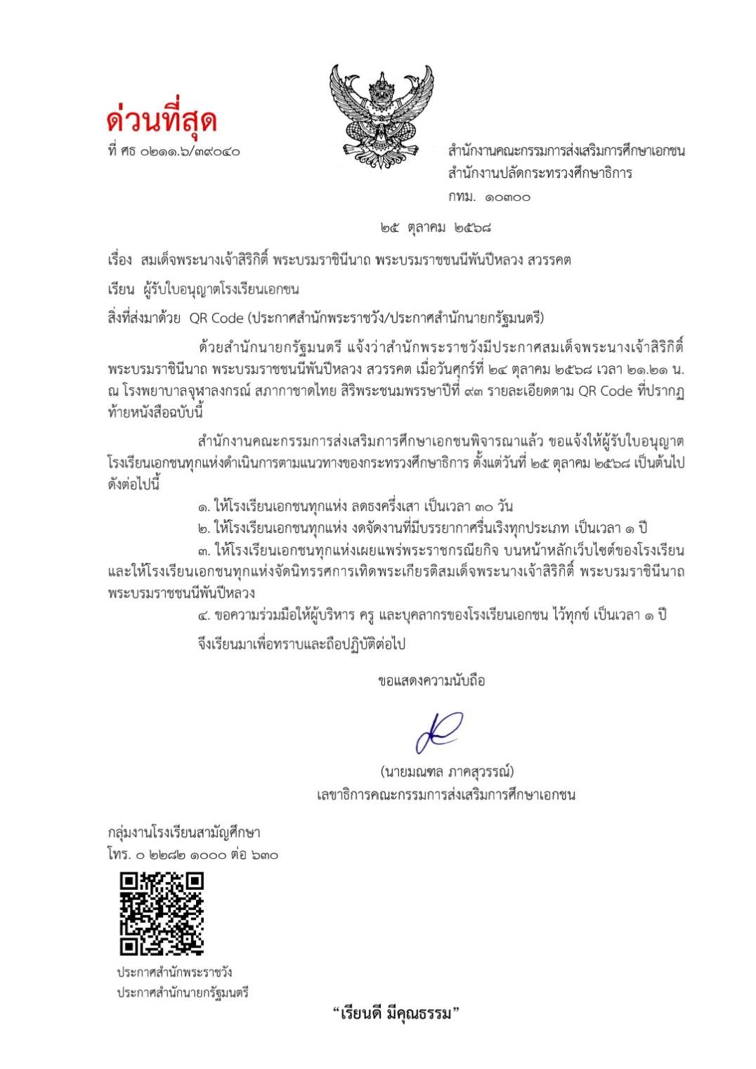 ด้วยสำนักนายกรัฐมนตรี แจ้งว่าสำนักพระราชวังมีประกาศสมเด็จพระนางเจ้าสิริกิติ์พระบรมราชินีนาถ พระบรมราชชนนีพันปีหลวง สวรรคต เมื่อวันศุกร์ที่ 24 ตุลาคม 2568 เวลา 21.21 น. ณ โรงพยาบาลจุฬาลงกรณ์ สภากาชาดไทย สิริพระชนมพรรษาปีที่ 93 โดยในส่วนของสำนักงานคณะกรรมการส่งเสริมการศึกษาเอกชน แจ้งผู้รับใบอนุญาตโรงเรียนเอกชนทุกแห่งดำเนินการตามแนวทางของกระทรวงศึกษาธิการ ตั้งแต่วันที่ 25 ตุลาคม 2568 เป็นต้นไป ดังต่อไปนี้