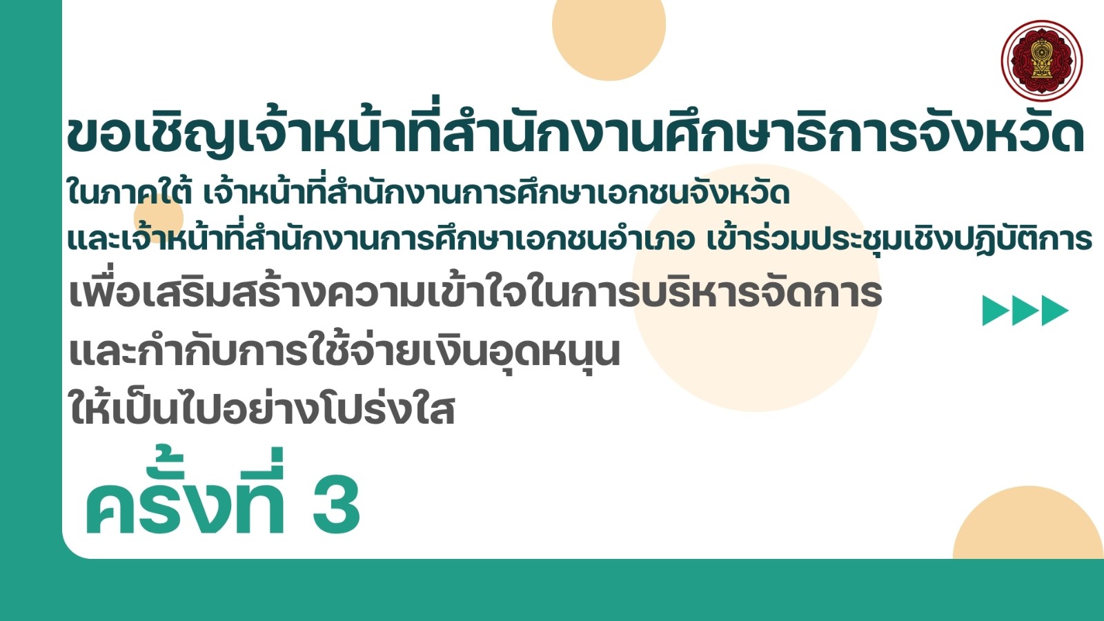 ขอเชิญเจ้าหน้าที่สำนักงานศึกษาธิการจังหวัดในภาคใต้ จำนวน 9 จังหวัด เจ้าหน้าที่สำนักงานการศึกษาเอกชนจังหวัด จำนวน 3 จังหวัด และเจ้าหน้าที่สำนักงานการศึกษาเอกชนอำเภอ ในจังหวัดยะลา และจังหวัดสงขลา เฉพาะ 4 อำเภอ จำนวน 12 อำเภอ เข้าร่วมประชุมเชิงปฏิบัติการเพื่อเสริมสร้างความเข้าใจในการบริหารจัดการและกำกับการใช้จ่ายเงินอุดหนุนให้เป็นไปอย่างโปร่งใส ครั้งที่ 3 ระหว่างวันที่ 2 - 3 กุมภาพันธ์ 2569 ณ โรงแรมหรรษา เจบี อำเภอหาดใหญ่ จังหวัดสงขลา ดังนี้