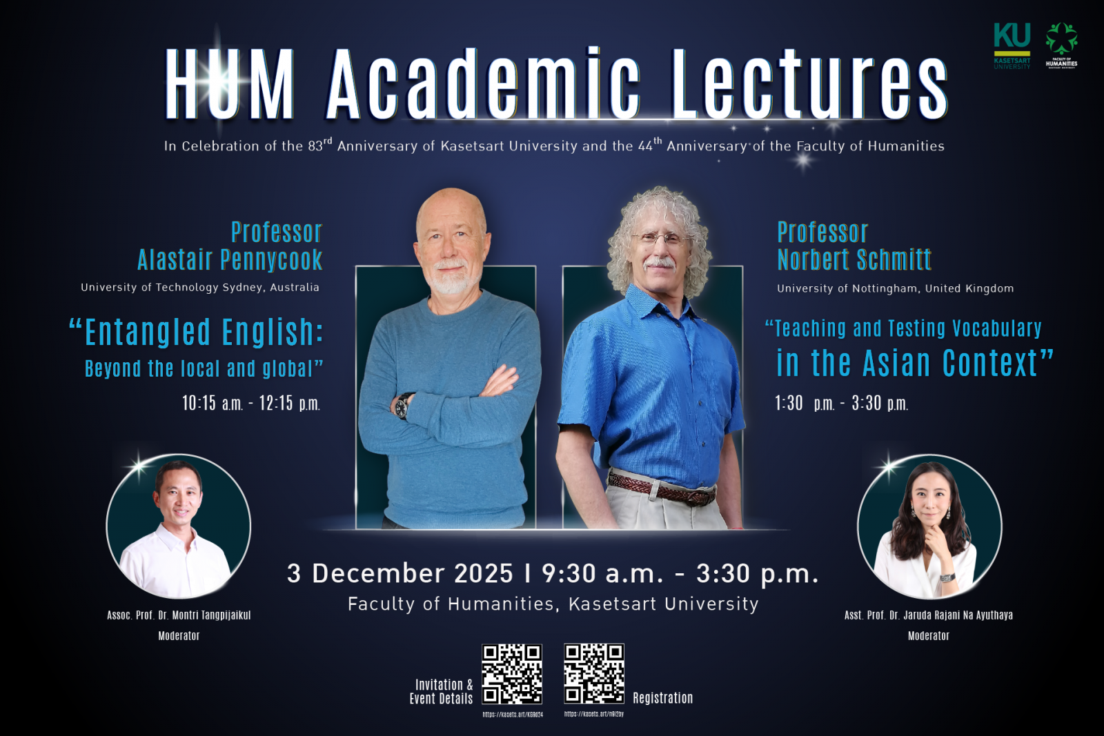 โครงการดังกล่าวมีวัตถุประสงค์เพื่อเฉลิมฉลองวาระครบรอบ 83 ปี แห่งการสถาปนามหาวิทยาลัยเกษตรศาสตร์ และ 44 ปี แห่งการสถาปนาคณะมนุษยศาสตร์ ตลอดจนเพื่อเผยแพร่และแลกเปลี่ยนองค์ความรู้ด้านมนุษยศาสตร์และสังคมศาสตร์ในระดับวิชาการ โดยได้รับเกียรติจากวิทยากรผู้ทรงคุณวุฒิจากต่างประเทศ 2 ท่าน ซึ่งเป็นผู้เชี่ยวชาญด้านภาษาอังกฤษและภาษาศาสตร์ประยุกต์ รวมทั้งยังมีผลงานตีพิมพ์ที่มีชื่อเสียงจำนวนมาก มาร่วมบรรยายพิเศษ ได้แก่