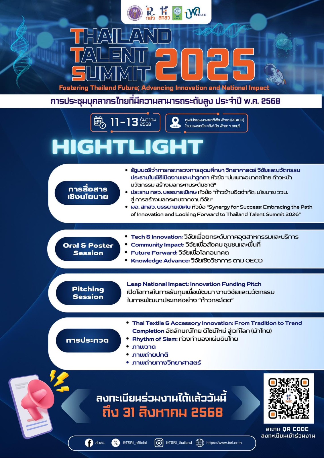 สำนักงานคณะกรรมการส่งเสริมวิทยาศาสตร์ วิจัยและนวัตกรรม (สกสว.) ขอเชิญเข้าร่วมงานกิจกรรมการประกวดผลงานสร้างสรรค์ ในงาน "Thailand Talent Summit 2025" เวทีแห่งโอกาสสำหรับนักวิจัย นักวิชาการ และผู้สร้างนวัตกรรมทั่วไทย ที่ไม่ควรพลาด!!