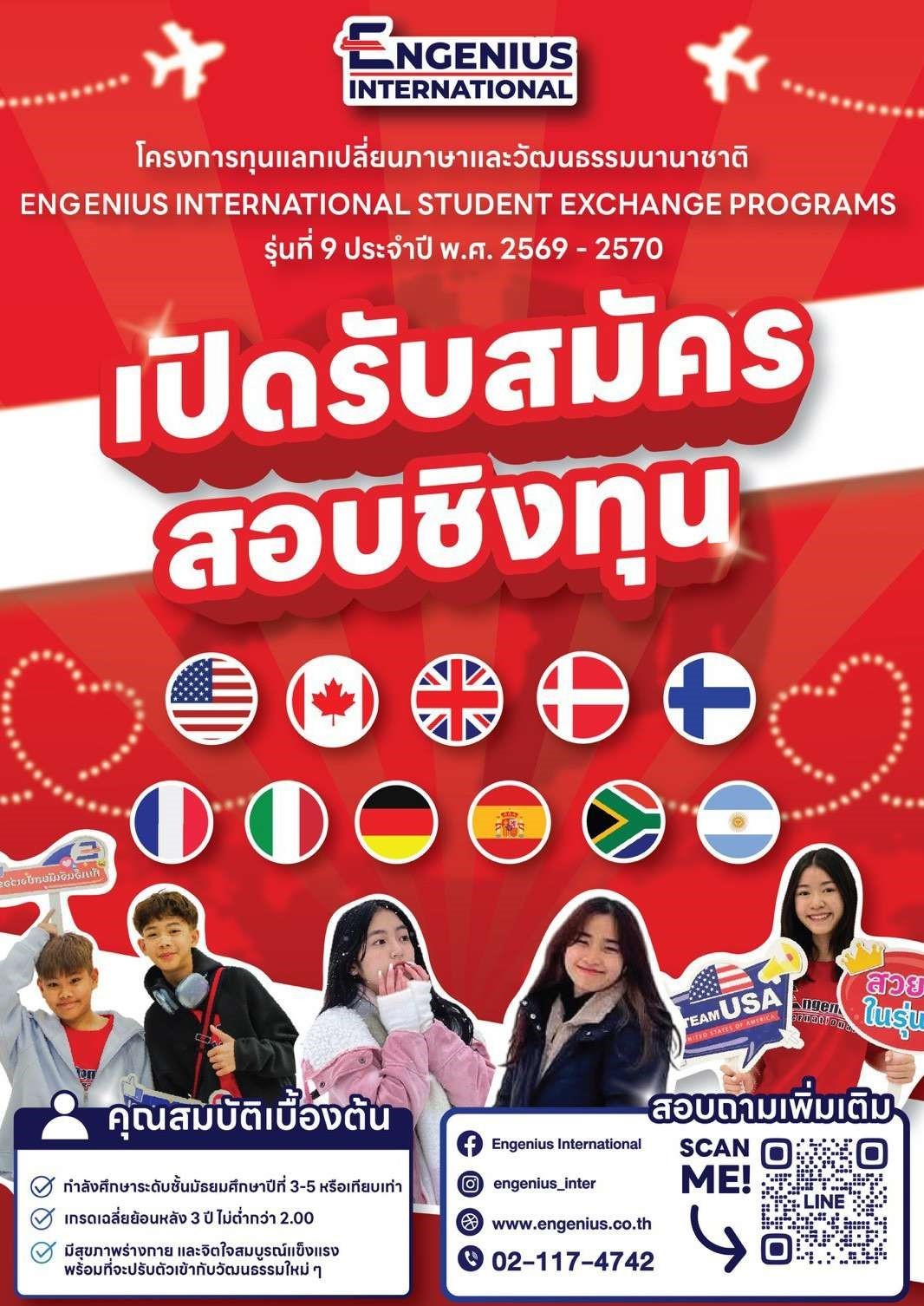 โครงการทุนแลกเปลี่ยนภาษาและวัฒนธรรมนานาชาติ Engenius International เปิดโอกาสให้เยาวชนไทยอายุ 15–18 ปี ได้เดินทางไปศึกษาในโรงเรียนมัธยมศึกษาตอนปลายที่ได้รับรองจากรัฐบาลท้องถิ่นและใช้ชีวิตในต่างแดนกับครอบครัวอุปถัมภ์อย่างใกล้ชิด ได้เรียนรู้ทักษะและประสบการณ์การใช้ชีวิตในต่างประเทศ และทำหน้าที่เป็นยุวทูตในการเผยแพร่ภาษาและวัฒนธรรมไทยให้เป็นที่รู้จักในสังคมโลก ทั้งนี้ โครงการฯ มีกำหนดจัดสอบในวันที่ 29 พฤศจิกายน 2568 ผ่านระบบออนไลน์