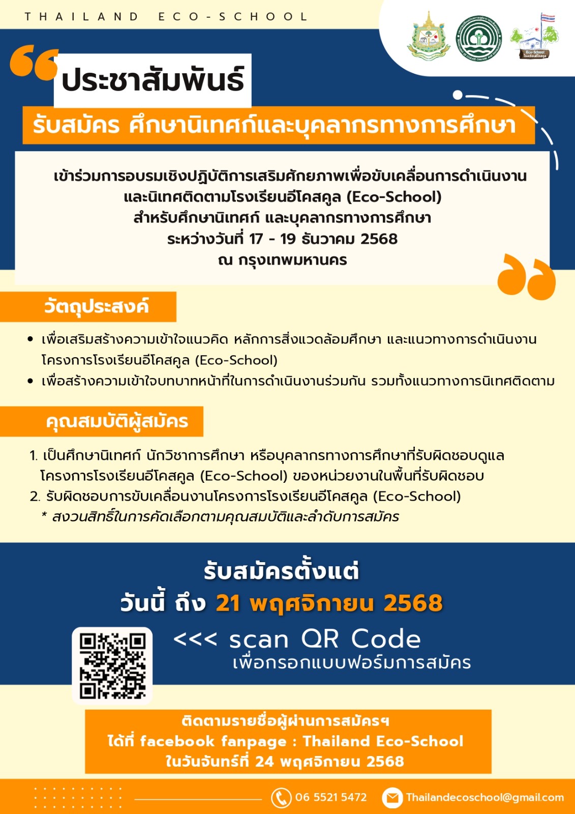 สำนักงานคณะกรรมการส่งเสริมการศึกษาเอกชน จึงขอประชาสัมพันธ์ให้ศึกษานิเทศก์และบุคลากรทางการศึกษาที่รับผิดชอบภารกิจการขับเคลื่อนโครงการโรงเรียนอีโคสคูล (Eco-School) หรืองานด้านสิ่งแวดล้อมในโรงเรียนเข้าร่วมอบรมเชิงปฏิบัติการฯ ตามวัน เวลา และสถานที่ดังกล่าว โดยสมัครผ่าน QR Code แบบฟอร์มการสมัครที่แนบมาพร้อมนี้ ภายในวันศุกร์ที่ 21 พฤศจิกายน 2568 และติดตามรายชื่อผู้ผ่านการสมัครเข้าร่วมอบรมเชิงปฏิบัติการฯ ทาง Faceboan page: Thailaok Fnd Eco-school ในวันจันทร์ที่ 24 พฤศจิกายน 2568 พร้อมประสานแจ้งไปยังผู้ที่ผ่านการสมัครโดยตรง และสงวนสิทธิ์การคัดเลือกผู้สมัครตามลำดับการสมัคร (สิ่งที่ส่งมาด้วย 2) โดยกรมการเปลี่ยนแปลงสภาพภูมิอากาศและสิ่งแวดล้อม จะเป็นผู้รับผิดชอบค่าที่พัก ค่าอาหาร และค่าพาหนะในการเดินทาง (ค่าโดยสารตามอัตราที่กรมขนส่งทางบกกำหนด)