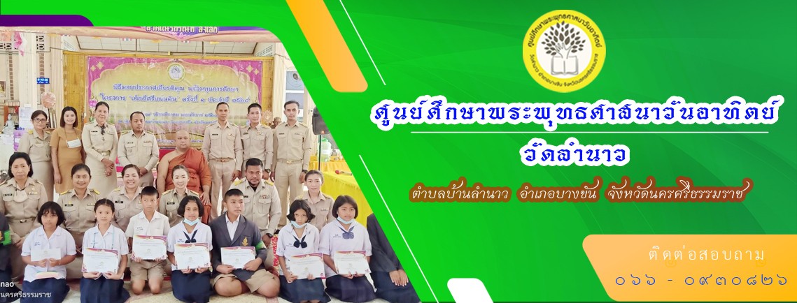 สอบถามข้อมูลเพิ่มเติมได้ที่ ศูนย์ศึกษาพระพุทธศาสนาวันอาทิตย์วัดลำนาว โทรศัพท์ 066-093-0826, 081-079-8462 หรือคลิ๊กที่ Link นี้ >>> Facebook ศูนย์ศึกษาพระพุทธศาสนาวันอาทิตย์วัดลำนาว