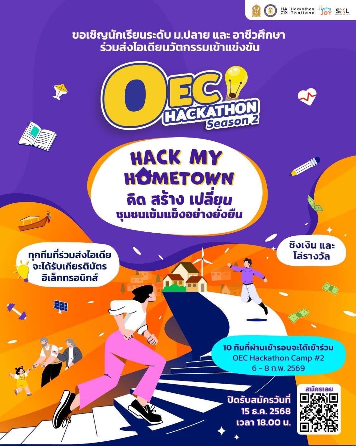 ด้วยสำนักงานเลขาธิการสภาการศึกษา ได้จัดกิจกรรม “OEC Hackathon Season 2 : Hack my hometown คิด สร้าง เปลี่ยน ชุมชนเข้มเข็มแข็งอย่างยั่งยืน” เพื่อสร้างเสริมชุดทักษะที่จำเป็น (Essential Skills Set) ของเยาวชนไทย ในระหว่างวันที่ 6 - 8 กุมภาพันธ์ 2568 อันเป็นการต่อยอดการนำร่อง ชุดทักษะที่จำเป็น (Essential Skills Set) ของเยาวชนไทย ตามมติที่ประชุมสภาการศึกษา ครั้งที่ 1/2567 เมื่อวันที่ 7 มีนาคม 2567 ซึ่งปีที่ผ่านมาประสบผลสำเร็จรวมถึงสะท้อนแนวโน้มเชิงบวกและข้อสังเกตสำหรับ การพัฒนาที่สำคัญ จึงขอประชาสัมพันธ์ให้โรงเรียนทราบ และแจ้งผู้ที่สนใจสมัครเข้าร่วมกิจกรรม “OEC Hackathon Season 2 : Hack my hometown คิด สร้าง เปลี่ยน ชุมชนเข้มแข็งอย่างยั่งยืน” โดยเปิดรับสมัครตั้งแต่บัดนี้ ถึงวันที่ 15 ธันวาคม 2568