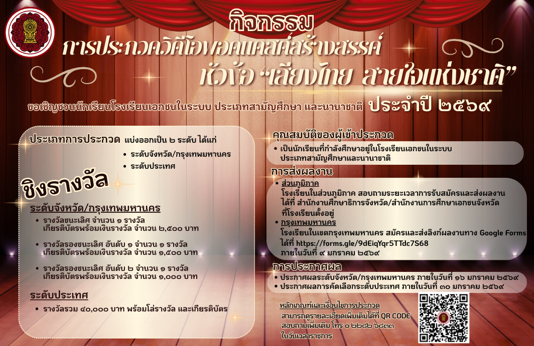 สำนักงานคณะกรรมการส่งเสริมการศึกษาเอกชน จึงขอให้โรงเรียนเอกชนแจ้งนักเรียนที่สนใจส่งผลงานของนักเรียนเข้าร่วมการประกวดวิดีโอพอดแคสต์สร้างสรรค์ หัวข้อ “เสียงไทย สายใจแห่งชาติ” ระดับกรุงเทพมหานคร โดยส่งใบสมัครและลิงก์ผลงาน ได้ที่ https://forms.gle/9dEiqYqr5TTdc7S68 ภายในวันที่ ๙ มกราคม ๒๕๖๙ เวลา ๒๓.๕๙ น. รายละเอียดตาม QR Code แนบท้ายหนังสือฉบับนี้ ทั้งนี้ โรงเรียนสามารถสมัครและส่งผลงานเข้าประกวดได้มากกว่า ๑ ทีม ซึ่งทีมที่ได้รับรางวัลชนะเลิศ ระดับกรุงเทพมหานคร จะเป็นตัวแทนเข้าประกวดระดับประเทศต่อไป