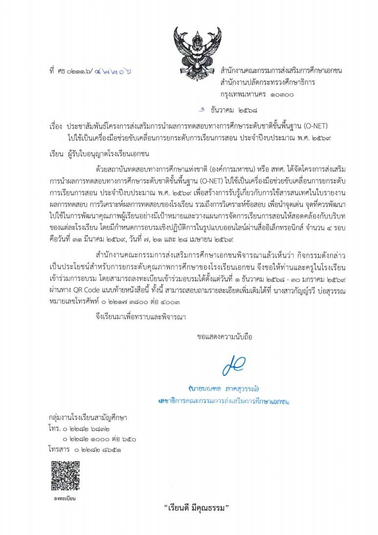 สำนักงานคณะกรรมการส่งเสริมการศึกษาเอกชนพิจารณาแล้วเห็นว่า กิจกรรมดังกล่าวเป็นประโยชน์สำหรับการยกระดับคุณภาพการศึกษาของโรงเรียนเอกชน จึงขอให้ท่านและครูในโรงเรียนเข้าร่วมการอบรม โดยสามารถลงทะเบียนเข้าร่วมอบรมได้ตั้งแต่วันที่ 1 ธันวาคม 2568 - 30 มกราคม 2569 ผ่านทาง QR Code แนบท้ายหนังสือนี้ ทั้งนี้ สามารถสอบถามรายละเอียดเพิ่มเติมได้ที่ นางสาวกัญญ์รวี บ่อสุวรรณ หมายเลขโทรศัพท์ 0 2217 3800 ต่อ 4003