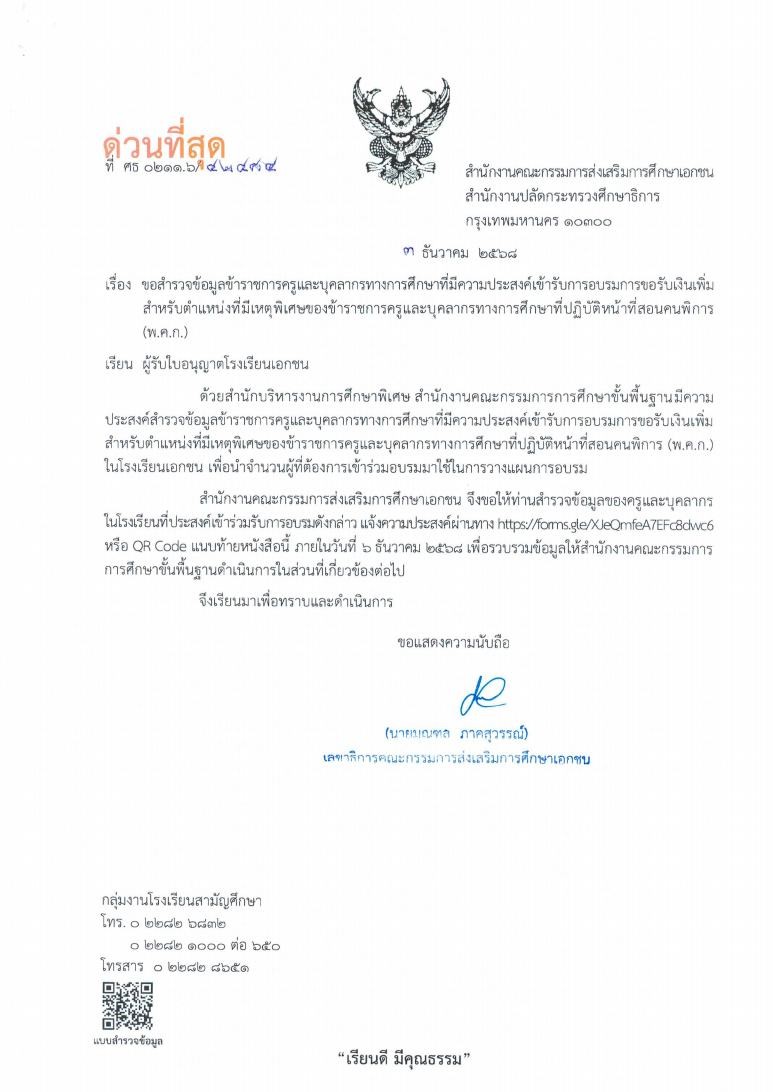 สำนักงานคณะกรรมการส่งเสริมการศึกษาเอกชน จึงขอให้ท่านสำรวจข้อมูลของครูและบุคลากรในโรงเรียนที่ประสงค์เข้าร่วมรับการอบรมดังกล่าว แจ้งความประสงค์ผ่านทาง https://forms.gle/XJeQmfeA7EFc8dwc6 หรือ QR Code แนบท้ายหนังสือนี้ ภายในวันที่ 6 ธันวาคม 2568 เพื่อรวบรวมข้อมูลให้สำนักงานคณะกรรมการการศึกษาขั้นพื้นฐานดำเนินการในส่วนที่เกี่ยวข้องต่อไป