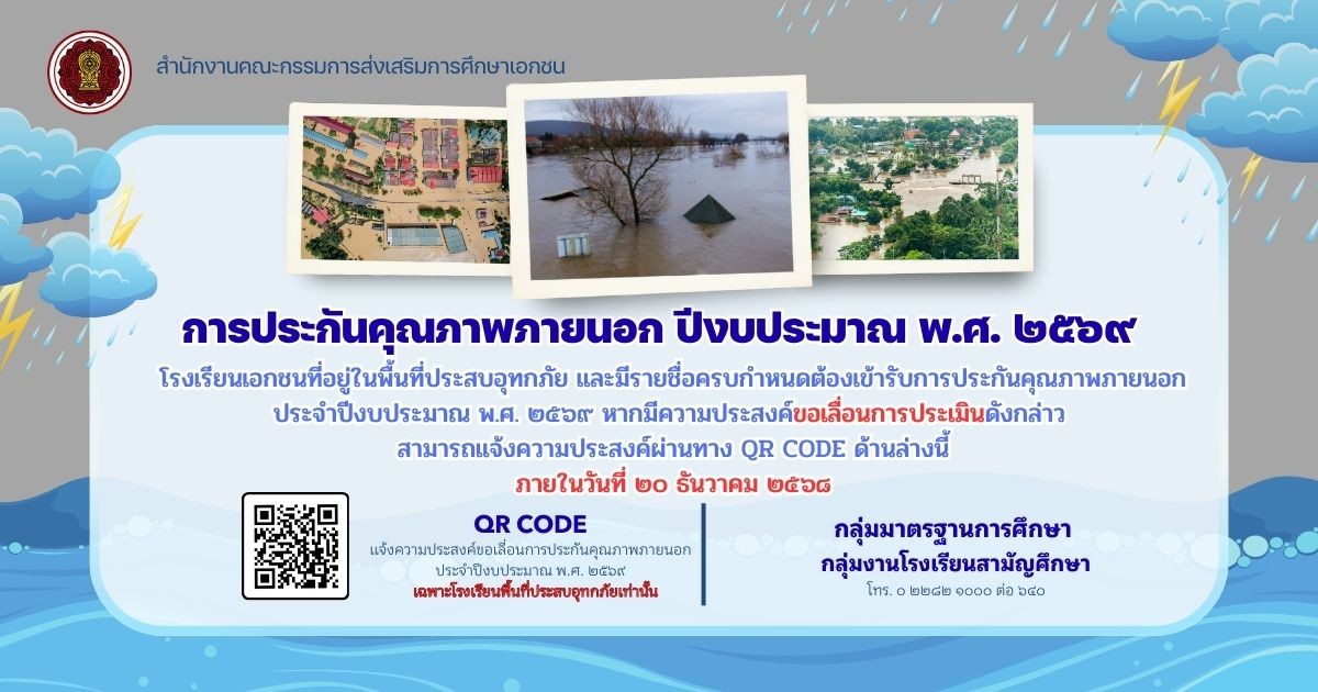 โรงเรียนเอกชนที่อยู่ในพื้นที่ประสบอุทกภัย และมีรายชื่อครบกำหนดต้องเข้ารับการประกันคุณภาพภายนอก ประจำปีงบประมาณ พ.ศ. ๒๕๖๙ หากมีความประสงค์ขอเลื่อนการประเมินดังกล่าว สามารถแจ้งความประสงค์ผ่านทาง QR CODE นี้ (ภายในวันที่ ๒๐ ธันวาคม ๒๕๖๙)