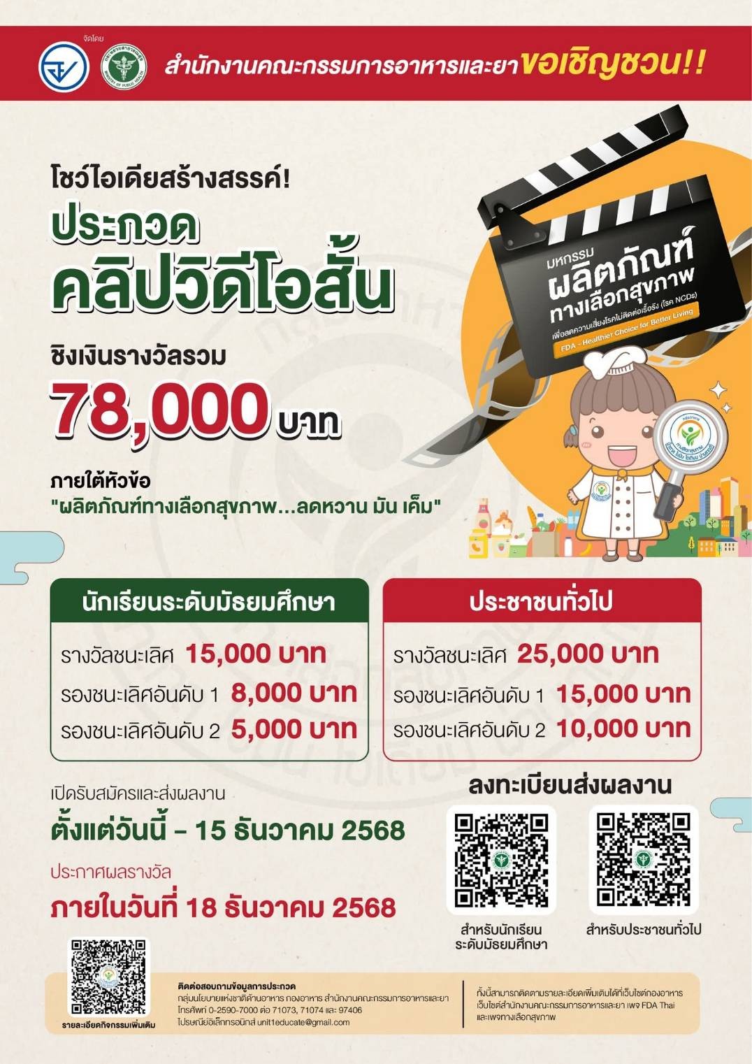 ขอเชิญชวนนักเรียนระดับชั้นมัธยมศึกษา และประชาชนที่สนใจ ร่วมส่งผลงานเข้าประกวดคลิปวิดีโอสั้นฯ ชิงเงินรางวัลกว่า 78,000 บาท ได้ตั้งแต่วันนี้ – 15 ธันวาคม 2568 และเข้าร่วมงานมหกรรมดังกล่าวตามวันและเวลาข้างต้น สามารถสอบถามรายละเอียดเพิ่มเติมได้ที่ กลุ่มนโยบายแห่งชาติด้านอาหาร กองอาหาร สำนักงานคณะกรรมการอาหารและยา (ผู้ประสานงาน: นางสาววริศรา ศรีเสนพิลา และนางสาวสุรางคณา มอญเพ็ชร) โทร 02 590 7000 ต่อ 71073, 71074 และ 97406 หรือไปรษณีย์อิเล็กทรอนิกส์ unit1educate@gmail.com ติดตามรายละเอียดเพิ่มเติมได้ที่ : เว็บไซต์กองอาหาร สำนักงานคณะกรรมการอาหารและยา เพจ FDA Thai และ เพจทางเลือกสุขภาพ