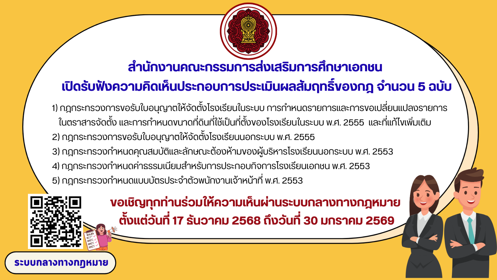 สำนักงานคณะกรรมการส่งเสริมการศึกษาเอกชน พิจารณาแล้วเห็นว่า เพื่อให้การประเมินผลสัมฤทธิ์ของกฎที่ออกตามพระราชบัญญัติโรงเรียนเอกชน พ.ศ. 2550 และที่แก้ไขเพิ่มเติม มีข้อมูลและความเห็นของผู้ที่เกี่ยวข้องอย่างรอบด้าน จึงขอความอนุเคราะห์ผู้ที่เกี่ยวข้องให้ความเห็นตามประเด็นการรับฟังความคิดเห็นผ่านระบบกลางทางกฎหมาย (https://law.go.th) ตั้งแต่วันที่ 17 ธันวาคม 2568 ถึงวันที่ 30 มกราคม 2569