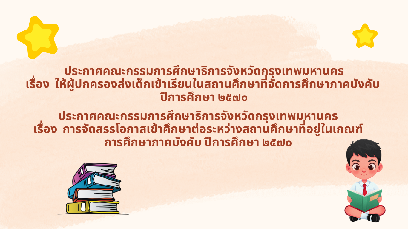 ด้วยสำนักงานเขตพื้นที่การศึกษาประถมศึกษากรุงเทพมหานคร ได้รับแจ้งประกาศคณะกรรมการศึกษาธิการจังหวัดกรุงเทพมหานคร โดยความเห็นชอบของคณะกรรมการศึกษาธิการจังหวัดกรุงเทพมหานคร ในคราวประชุมครั้งที่ ๗/๒๕๖๘ เมื่อวันที่ ๑๐ พฤศจิกายน ๒๕๖๘ เรื่อง ให้ผู้ปกครองส่งเด็กเข้าเรียนในสถานศึกษาที่จัดการศึกษาภาคบังคับ ปีการศึกษา ๒๕๗๐ และประกาศคณะกรรมการศึกษาธิการจังหวัดกรุงเทพมหานคร เรื่อง การจัดสรรโอกาสเข้าศึกษาต่อระหว่างสถานศึกษาที่อยู่ในเกณฑ์การศึกษาภาคบังคับ ปีการศึกษา ๒๕๗๐ ตามพระราชบัญญัติการศึกษาภาคบังคับ พุทธศักราช ๒๕๔๕ มาตรา ๕