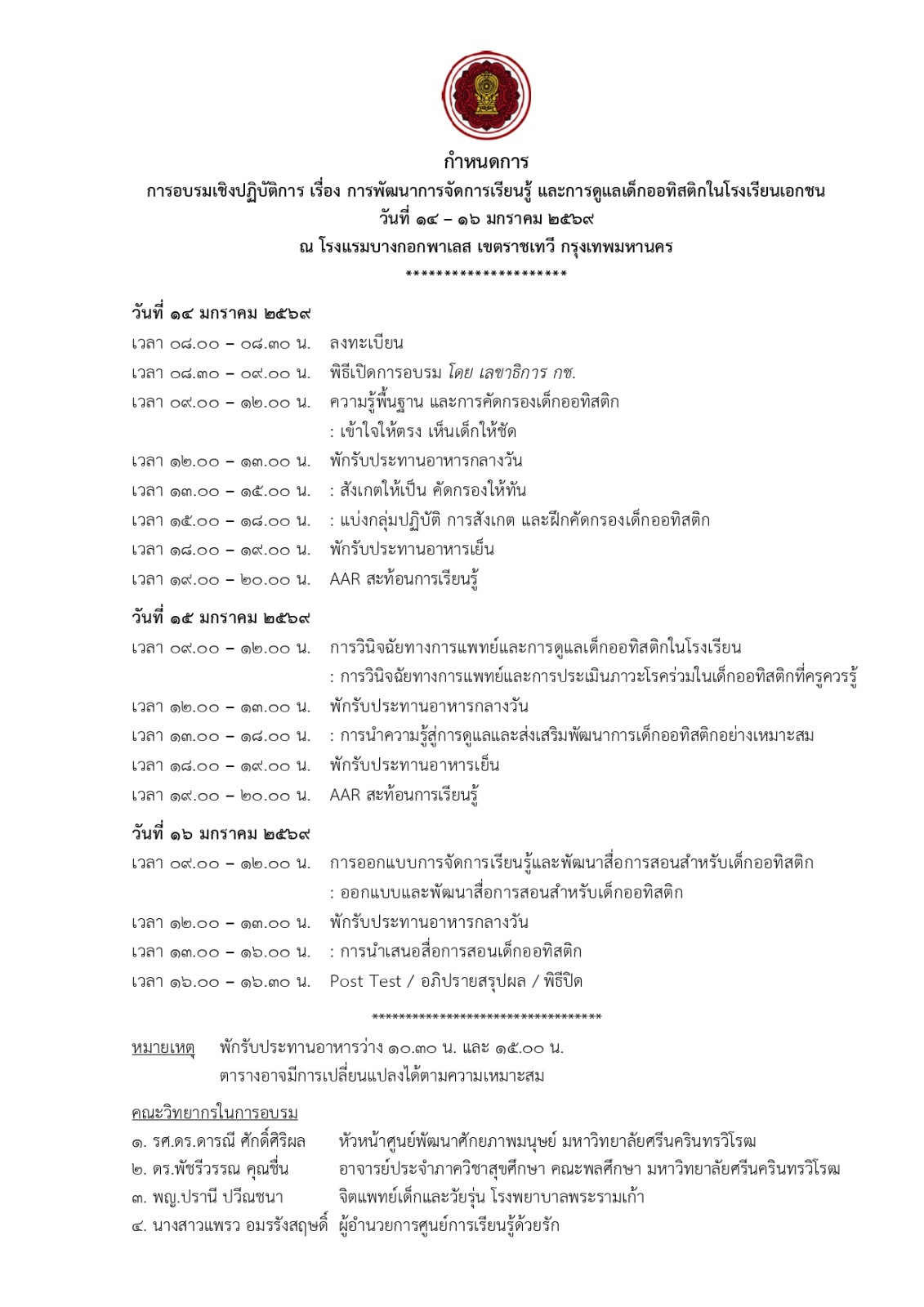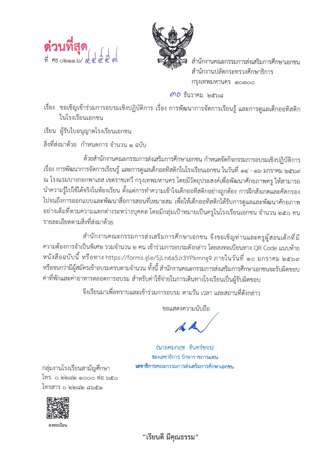 ขอเชิญเข้าร่วมการอบรมเชิงปฏิบัติการ เรื่อง การพัฒนาการจัดการเรียนรู้ และการดูแลเด็กออทิสติกในโรงเรียนเอกชน
