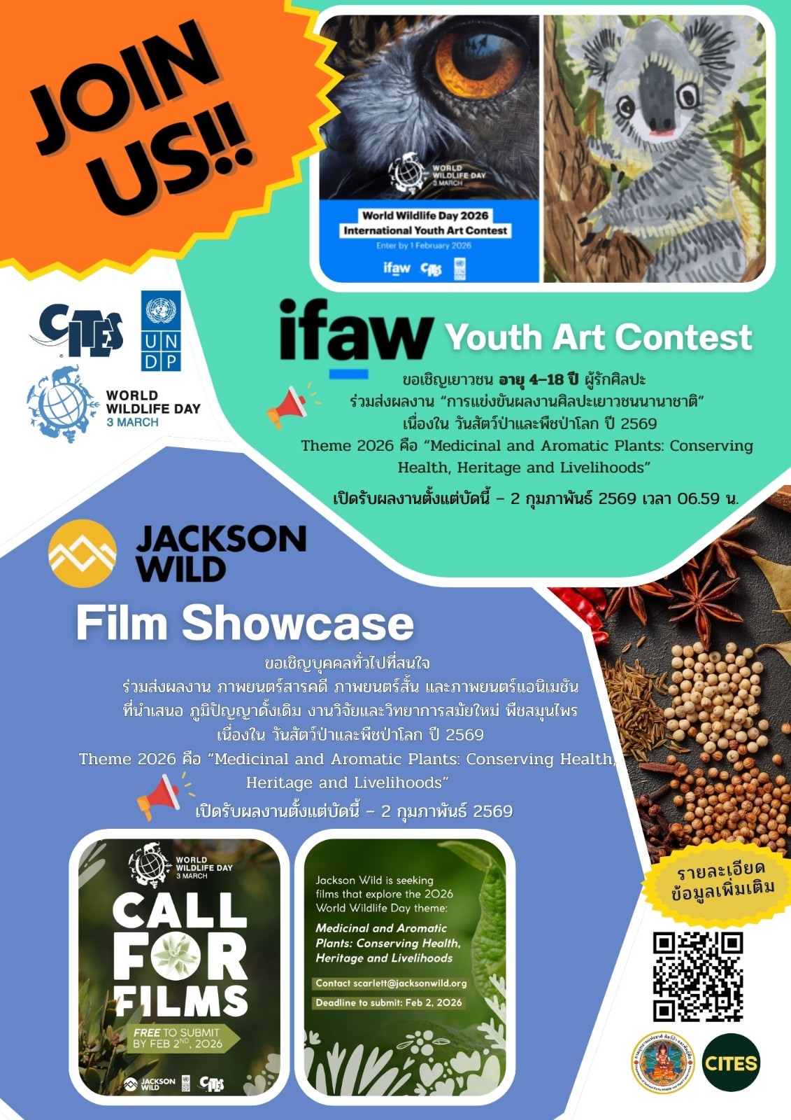จึงขอเชิญชวนน้อง ๆ เยาวชน อายุตั้งแต่ 4 - 18 ปี และประชาชนที่สนใจ ร่วมส่งผลงานเข้าร่วมการประกวดดังกล่าว ตั้งแต่วันนี้ - 2 กุมภาพันธ์ 2569 เวลา 06.59 น. (ตามวันและเวลาในประเทศไทย) สามารถสอบถามรายละเอียดเพิ่มเติมได้ที่ กองคุ้มครองพันธุ์สัตว์ป่าและพืชป่าตามอนุสัญญา โทร: 0 2561 0777 ต่อ 1495 หรือไปรษณีย์อิเล็กทรอนิกส์: citesthailand@yahoo.com หรือ Facebook Page “World Wildlife Day Thailand” คลิกที่นี่