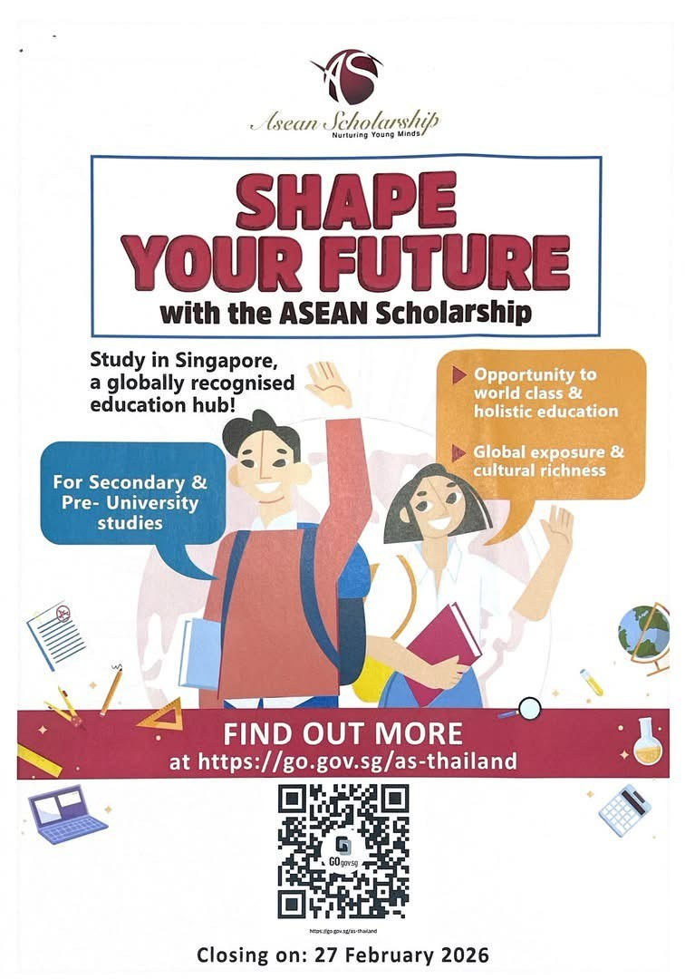 ด้วยกระทรวงศึกษาธิการสิงคโปร์ มีหนังสือประชาสัมพันธ์รับสมัครทุนการศึกษา ASEAN Scholarship for Thailand ประจำปีการศึกษา 2570 ในระดับ Secondary 3 (ระยะเวลาศึกษา 4 ปี) และระดับ Pre-University (ระยะเวลาศึกษา 2 ปี) โดยผู้ที่ได้รับการคัดเลือกในขั้นสุดท้ายจะได้รับทุนการศึกษา เต็มจำนวน ซึ่งครอบคลุมถึงค่าเล่าเรียน ค่าที่พัก ค่าครองชีพ ค่าตั๋วเครื่องบินไป – กลับ ระหว่างประเทศ สิทธิ์การรักษาพยาบาลแบบพื้นฐาน ประกันอุบัติเหตุ และสิทธิประโยชน์อื่น ๆ ตามที่กระทรวงศึกษาธิการ สิงคโปร์กำหนด