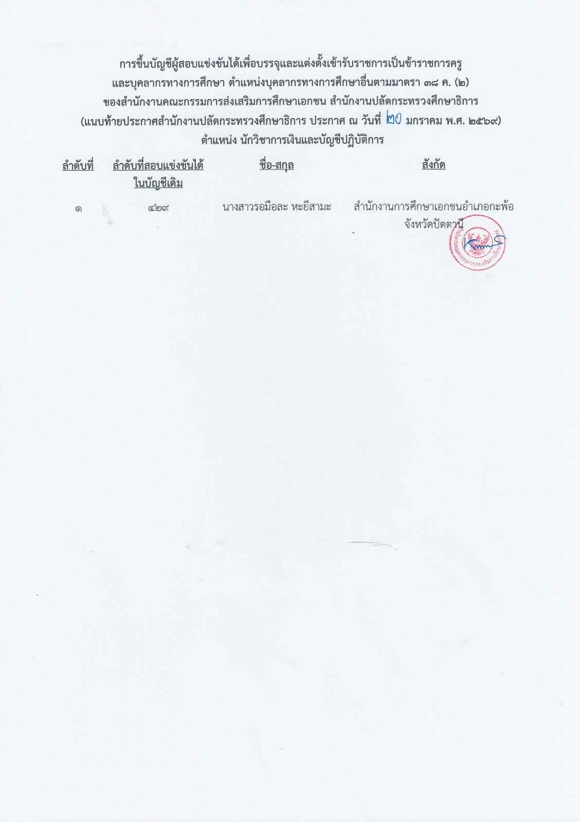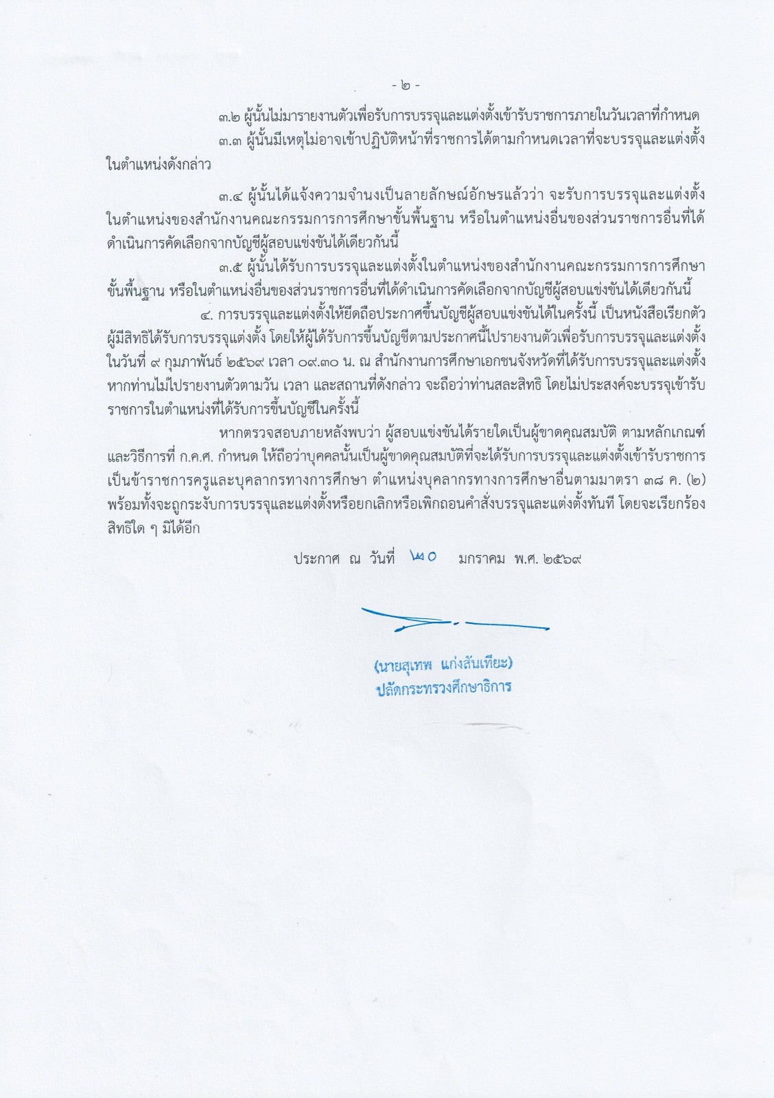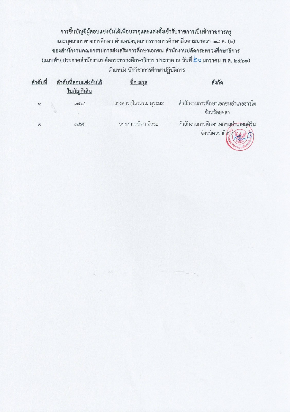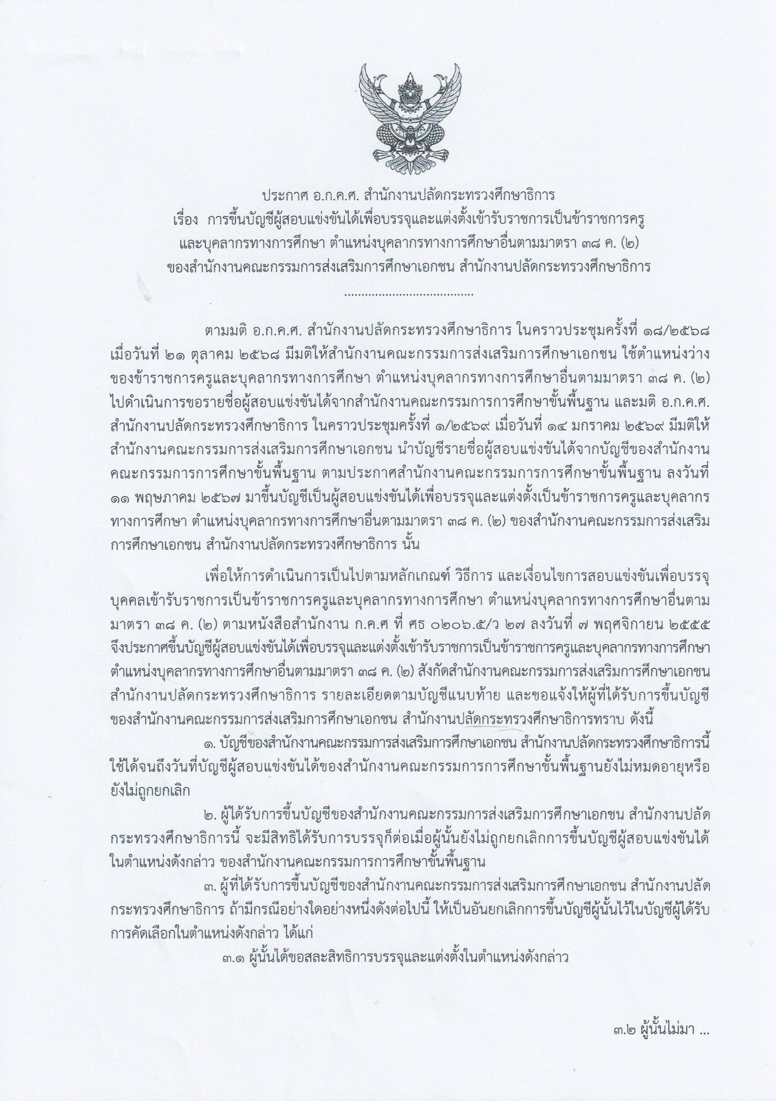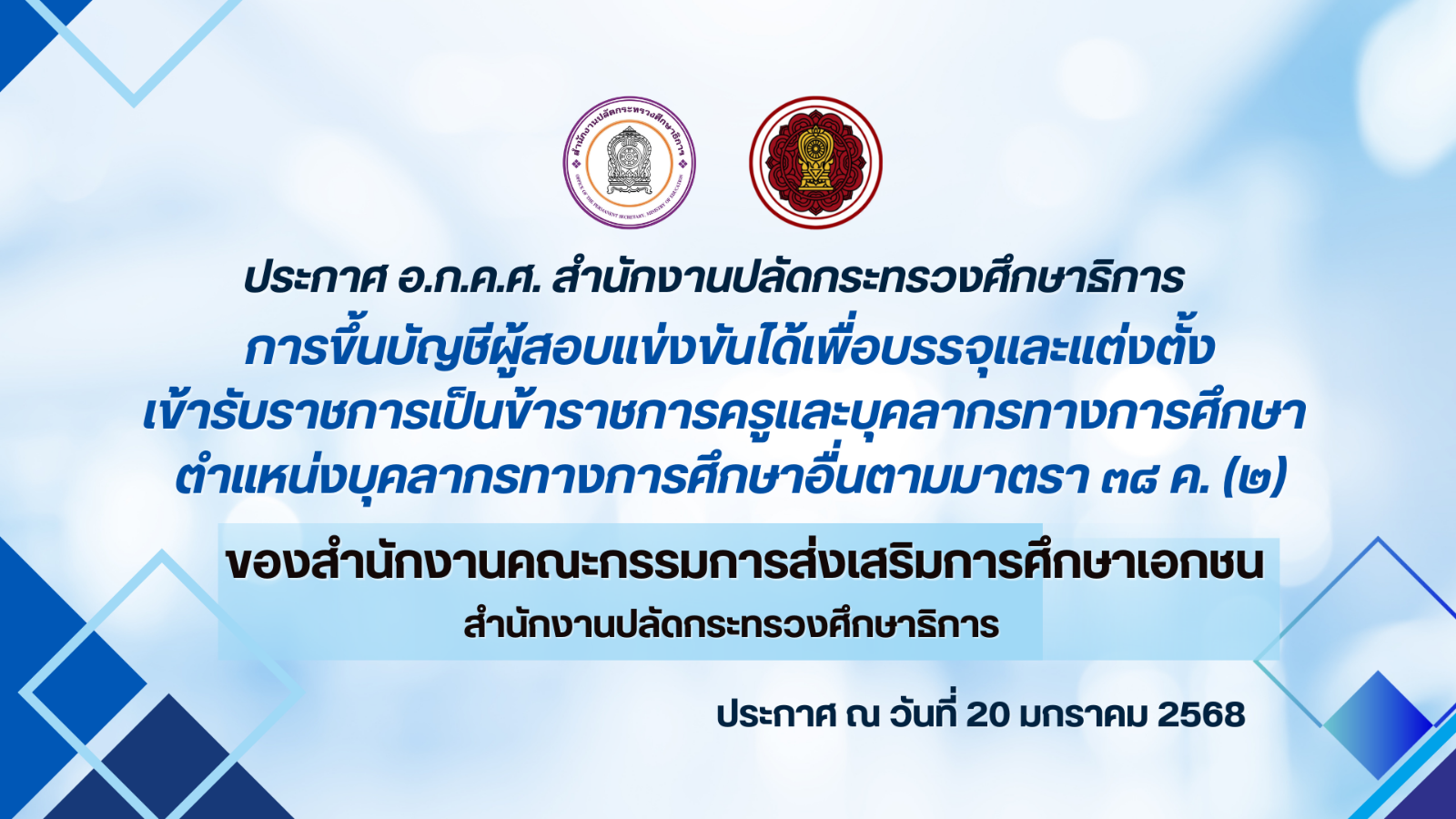 ประกาศ อ.ก.ค.ศ. สำนักงานปลัดกระทรวงศึกษาธิการ เรื่อง การขึ้นบัญชีผู้สอบแข่งขันได้เพื่อบรรจุและแต่งตั้งเข้ารับราชการเป็นข้าราชการครู และบุคลากรทางการศึกษา ตำแหน่งบุคลากรทางการศึกษาอื่นตามมาตรา ๓๘ ค. (๒) ของสำนักงานคณะกรรมการส่งเสริมการศึกษาเอกชน สำนักงานปลัดกระทรวงศึกษาธิการ ประกาศ ณ วันที่ 20 มกราคม พ.ศ. 2569
