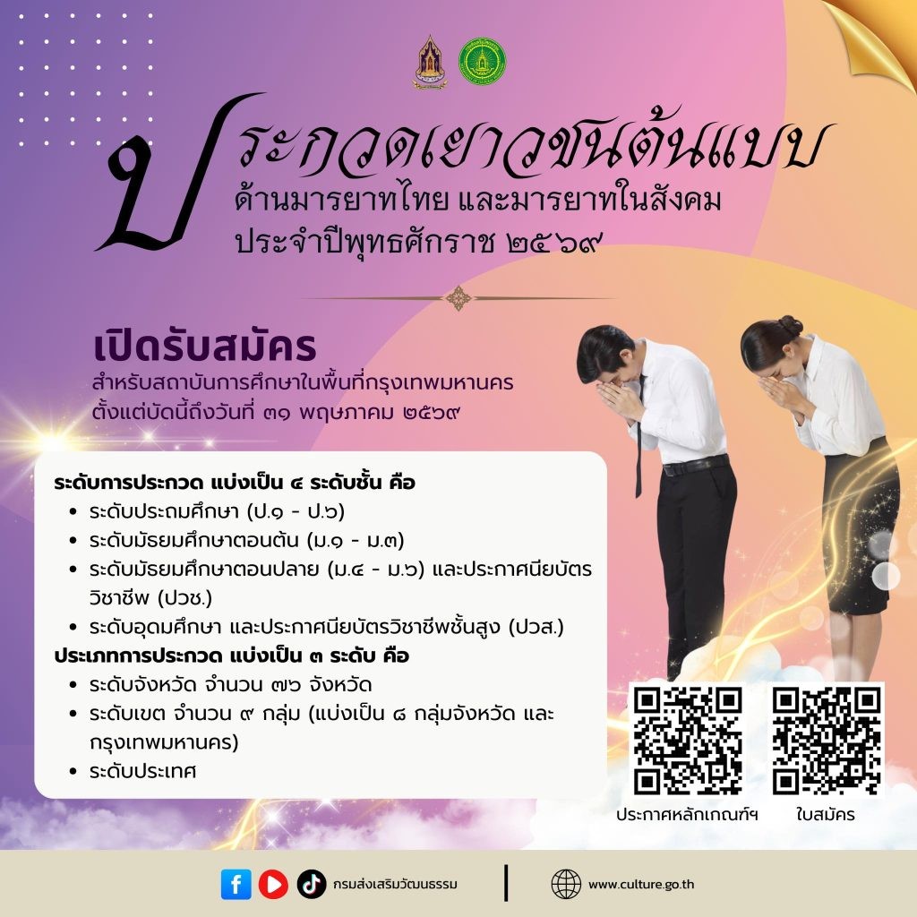กรมส่งเสริมวัฒนธรรม กระทรวงวัฒนธรรม จัดประกวดเยาวชนต้นแบบด้านมารยาทไทย และมารยาทในสังคม ประจำปีพุทธศักราช 2569 ด้วยตระหนักถึงภารกิจในการส่งเสริม สืบสาน รักษา ต่อยอด และปกป้องมรดกภูมิปัญญาทางวัฒนธรรม รวมทั้งการตอบสนองนโยบายแลยุทธศาสตร์ชาติ ด้านการพัฒนาและเสริมสร้างศักยภาพทรัพยากรมนุษย์ โดยการปลูกฝังวัฒนธรรมและค่านิยมที่พึงประสงค์ เพื่อหล่อหลอมเด็ก เยาวชน และการขัดเกลาทางสังคมให้คนไทยมีคุณธรรม จริยธรรม จิตสาธารณะและรักษาธรรมเนียมประเพณีอันดีงาม ประกอบกับคณะรัฐมนตรี มีมติเห็นชอบการกำหนดให้การไหว้ เป็นเอกลักษณ์ประจำชาติ ประเภทการทักทายและการแสดงความเคารพแบบไทย เมื่อวันที่ 11 มิถุนายน 2567