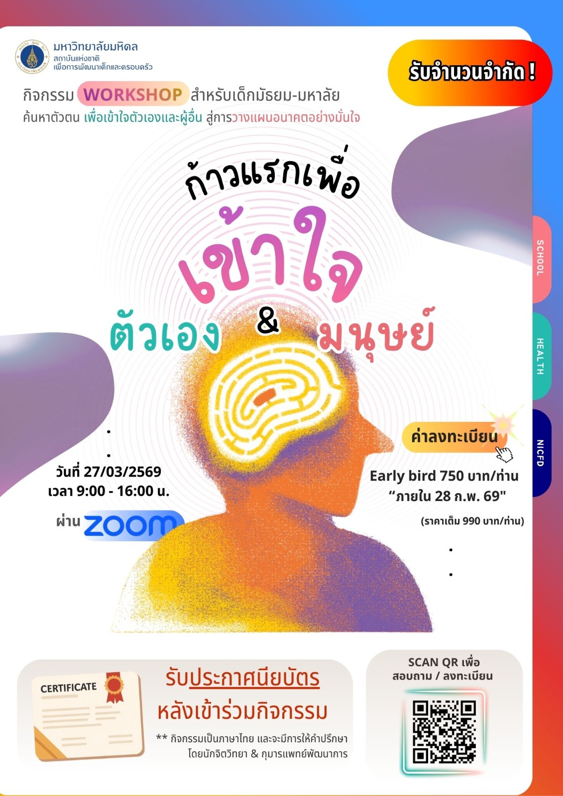 สถาบันแห่งชาติเพื่อการพัฒนาเด็กและครอบครัว มหาวิทยาลัยมหิดล จัดโครงการ "ก้าวแรกเพื่อเข้าใจตนเองและเข้าใจมนุษย์" การอบรมเชิงปฏิบัติการออนไลน์ เรื่อง "การพัฒนาตนเองด้วยแนวคิดจิตวิทยา"