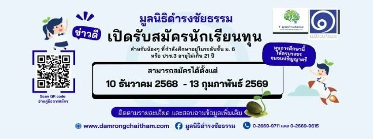 ด้วยสำนักงานปลัดกระทรวงศึกษาธิการ แจ้งว่า ได้มีหนังสือจากมูลนิธิดำรงชัยธรรมขอประชาสัมพันธ์โครงการทุนสร้างคน สร้างบัณฑิต รุ่นที่ 25/2569 โดยมูลนิธิดำรงชัยธรรมมีความประสงค์เปิดรับสมัครผู้ที่สนใจขอรับทุนการศึกษาสำหรับศึกษาต่อในระดับปริญญาตรีทั่วประเทศ และเปิดรับสมัครตั้งแต่บัดนี้จนถึงวันที่ 13 กุมภาพันธ์ 2569 ทั้งนี้ สามารถสอบถามข้อมูลเพิ่มเติมได้ที่ คุณอัฒณี สุมะนานนท์ ผู้ประสานงาน หมายเลขโทรศัพท์ 0 2669 9615 หรือ 0 2669 9711