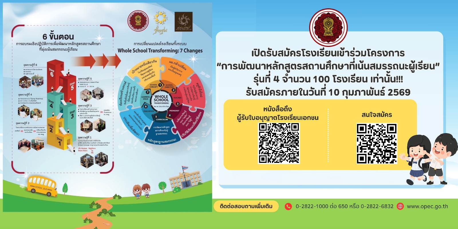 สำนักงานคณะกรรมการส่งเสริมการศึกษาเอกชนขอเรียนว่า หากโรงเรียนสนใจเข้าร่วมโครงการ “การพัฒนาหลักสูตรสถานศึกษาที่เน้นสมรรถนะผู้เรียน” ขอให้ส่งใบสมัครทาง QR Code ท้ายหนังสือนี้ หรือ https://forms.gle/myBEwmpTCBeoV9DXA ภายในวันที่ 10 กุมภาพันธ์ 2569 โดยจะประกาศรายชื่อโรงเรียนที่เข้าร่วมโครงการ ในวันที่ 13 กุมภาพันธ์ 2569 ทางเว็บไซต์ www.opec.go.th เพื่อแจ้งวัน เวลา และสถานที่ในการอบรมและลงนาม MOU ร่วมกันต่อไป ทั้งนี้ โรงเรียนที่สมัคร เข้าร่วมโครงการ ผู้บริหารและครูจะต้องเข้าร่วมการอบรมอย่างต่อเนื่องตลอดโครงการ