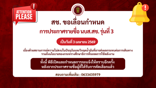 สช. ขอเลื่อนกำหนดการประกาศรายชื่อผู้ได้รับการคัดเลือกเข้าร่วมโครงการ นบส.สช. รุ่นที่ 3