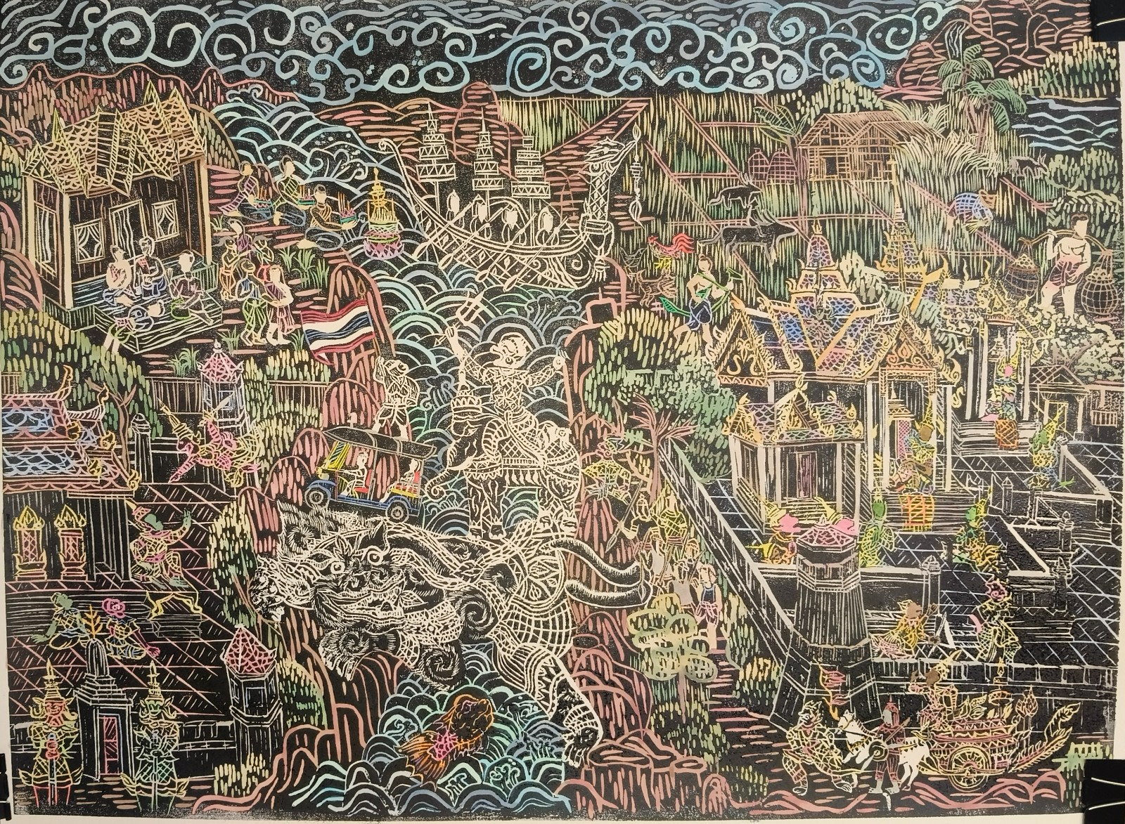 ผลงานนี้โดดเด่นด้านเทคนิคการแกะไม้ที่แม่นยำ ผสานสีน้ำได้ลงตัว มีรายละเอียดสูงแต่ยังคุมองค์ประกอบได้ดีพร้อมทั้งสื่ออัตลักษณ์ไทย สะท้อนวิถีชีวิตไทย วัฒนธรรม สถาปัตยกรรม และความเชื่อ