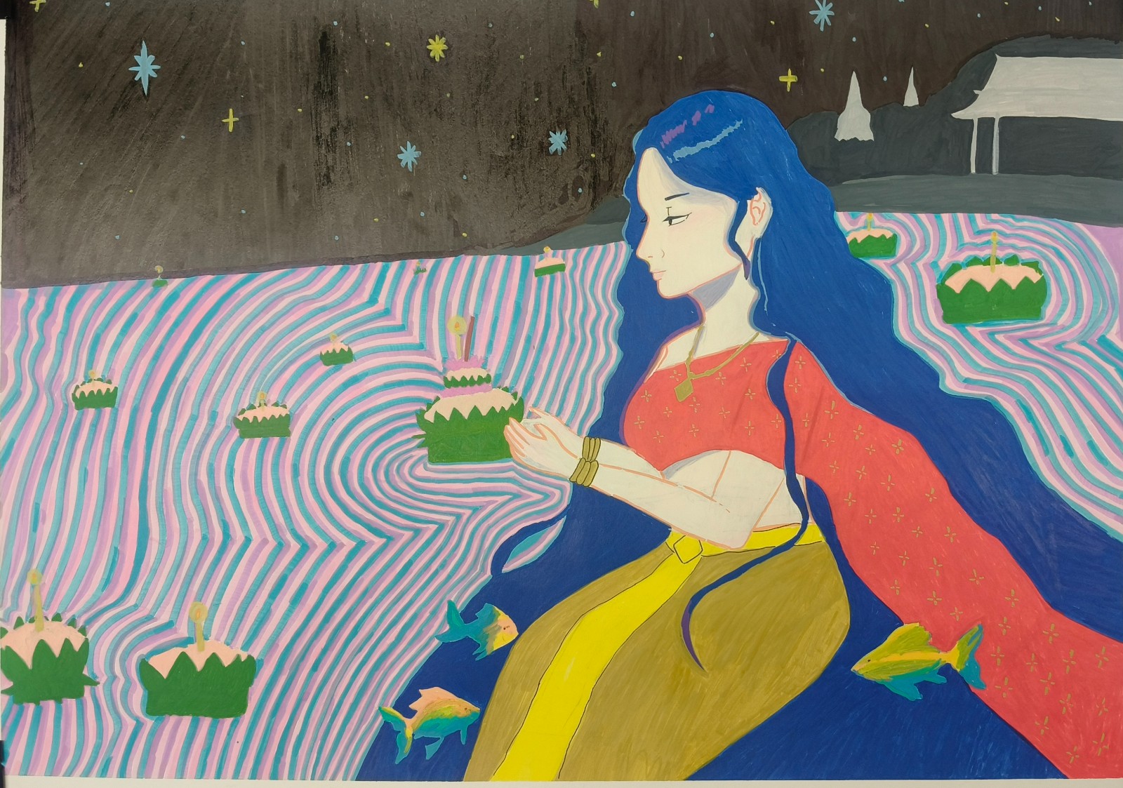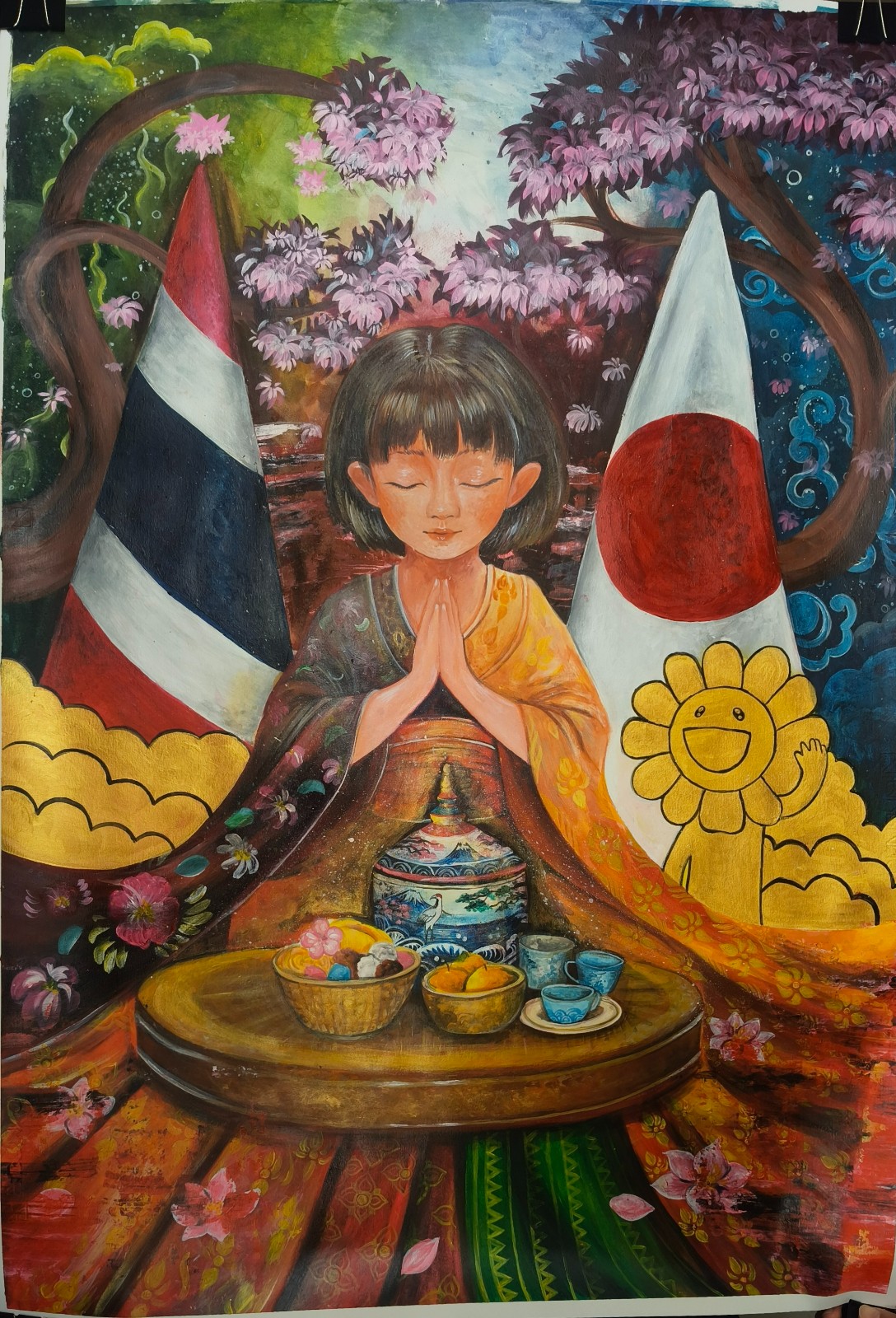 ผลงานนี้โดดเด่นจากการลงสี มีมิติ ใช้โทนสีร้อนตัดกับโทนเย็นอย่างสมดุล สร้างจุดโฟกัสชัดเจนและองค์ประกอบภาพสมบูรณ์ มีการเล่าเรื่องที่ผสมความเป็นไทย–ญี่ปุ่นแบบลงตัว