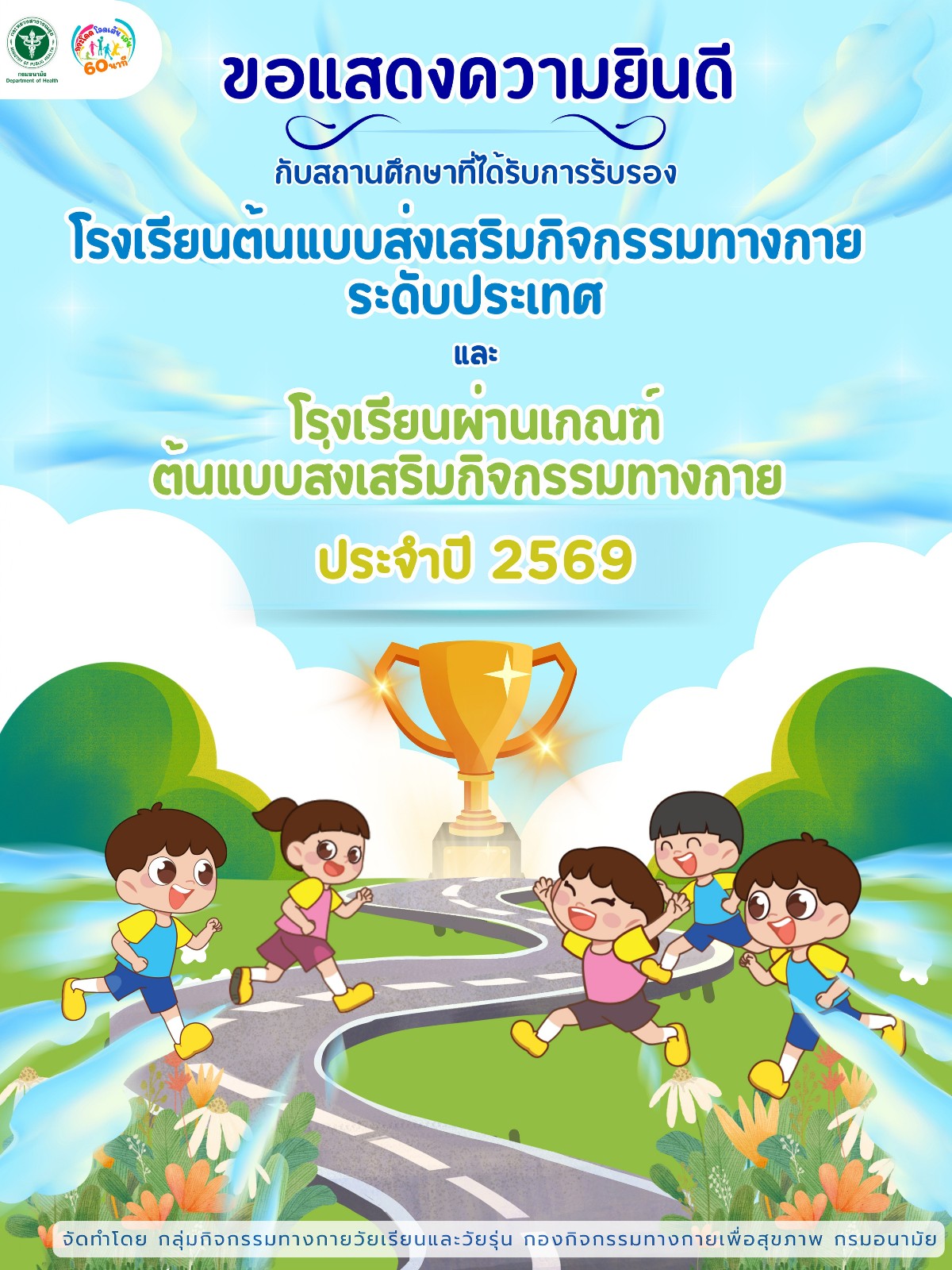 ด้วยกรมอนามัย ขอประชาสัมพันธ์ผลการพิจารณารางวัลโรงเรียนต้นแบบส่งเสริมกิจกรรมทางกายและโรงเเรียนผ่านเกณฑ์ต้นแบบส่งเสริมกิจกรรมทางกาย ประจำปี 2569 เพื่อเป็นการประชาสัมพันธ์ เชิดชูเกียรติและสร้างขวัญกำลังใจให้แก่สถานศึกษาในการส่งเสริมกิจกรรมทางกายอย่างต่อเนื่องและยั่งยืน ทั้งนี้ มีโรงเรียนที่ผ่านเกณฑ์การประเมินดังกล่าว โดยแบ่งเป็น 2 ประเภท ได้แก่