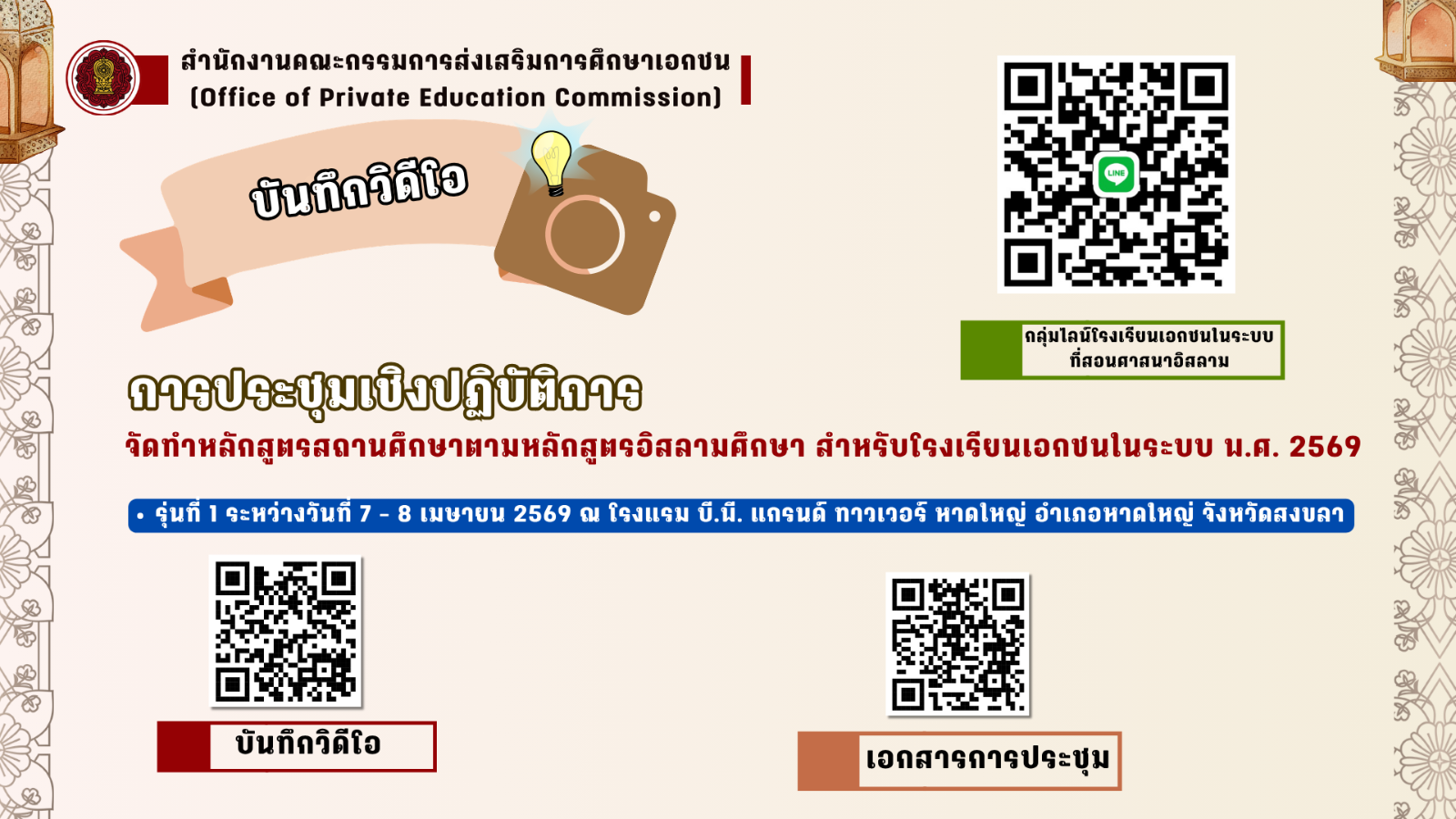 สำนักงานคณะกรรมการส่งเสริมการศึกษาเอกชน (สช.) ได้จัดประชุมเชิงปฏิบัติ “การจัดทำหลักสูตรสถานศึกษาตามหลักสูตรอิสลาม สำหรับโรงเรียนเอกชนในระบบ พ.ศ. 2569” เมื่อวันที่ 7 - 8 เมษายน 2569 ณ โรงแรมบีพี แกรนด์ทาวเวอร์ หาดใหญ่ อ. หาดใหญ่ จ. สงขลา เพื่อส่งเสริมความรู้ ความเข้าใจเกี่ยวกับการจัดทำหลักสูตรสถานศึกษาตามหลักสูตรอิสลามศึกษา สำหรับโรงเรียนเอกชนในระบบ พ.ศ. 2569 ซึ่งเป็นหลักสูตรที่ได้รับการพัฒนาขึ้นเพื่อปรับปรุงจากหลักสูตรอิสลามศึกษา พ.ศ. 2546 ให้มีความทันสมัย สอดคล้องกับการเปลี่ยนแปลงของสังคมและองค์ความรู้ในปัจจุบัน โดยมุ่งเน้นการพัฒนาผู้เรียนให้มีความรู้ ทักษะ เจตคติ คุณธรรม และจริยธรรมบนพื้นฐานของหลักอิสลามควบคู่กับความเป็นสากล โดยหลักสูตรดังกล่าวยังให้ความสำคัญกับการกำหนดมาตรฐานการเรียนรู้ ตัวชี้วัด รวมถึงการวัดและประเมินผลอย่างชัดเจน เพื่อให้ผู้เรียนสามารถดำรงชีวิตตามหลักศาสนาอิสลามได้อย่างเหมาะสม และอยู่ร่วมกับผู้อื่นในสังคมได้อย่างมีความสุข ตลอดจนส่งเสริมการเรียนรู้ที่สอดคล้องกับบริบท อัตลักษณ์ และความต้องการของแต่ละพื้นที่