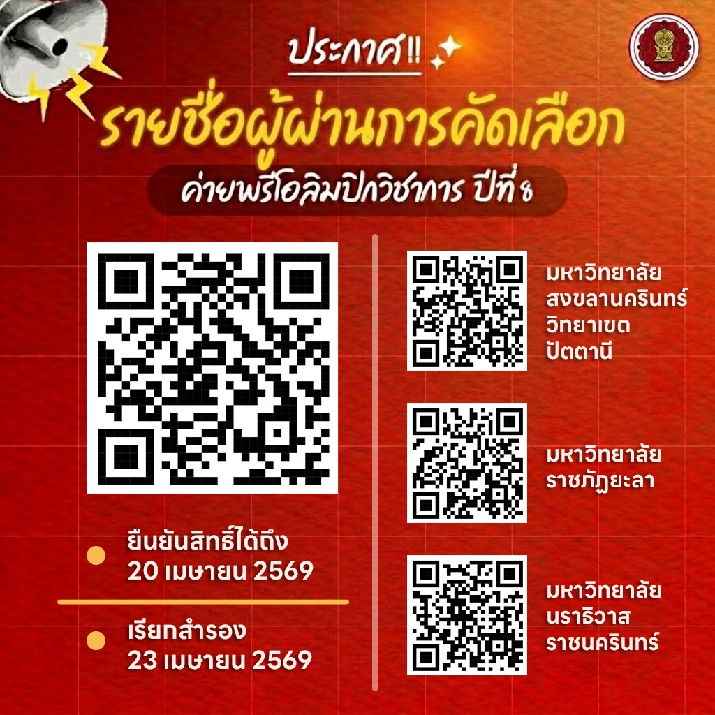 สำนักงานคณะกรรมการส่งเสริมการศึกษาเอกชน ได้มีประกาศสำนักงานฯ เรื่อง ผลสอบคัดเลือกเข้าค่ายพรีโอลิมปิกวิชาการนักเรียนในพื้นที่จังหวัดชายแดนภาคใต้ ปีที่ 8 ปีงบประมาณ พ.ศ.2569 เพื่อเข้าค่ายฝึกอบรมทางวิชาการ ค่ายที่ 1 ระหว่างวันที่ 1 - 10 พฤษภาคม 2569 โดยขอประกาศรายชื่อนักเรียนที่ผ่านการคัดเลือกเข้าค่ายฯ และขึ้นบัญชีผู้สอบผ่านการคัดเลือกเข้าค่ายฯ ปีที่ 8 ปีงานประมาณ พ.ศ. 2569 ดังนี้