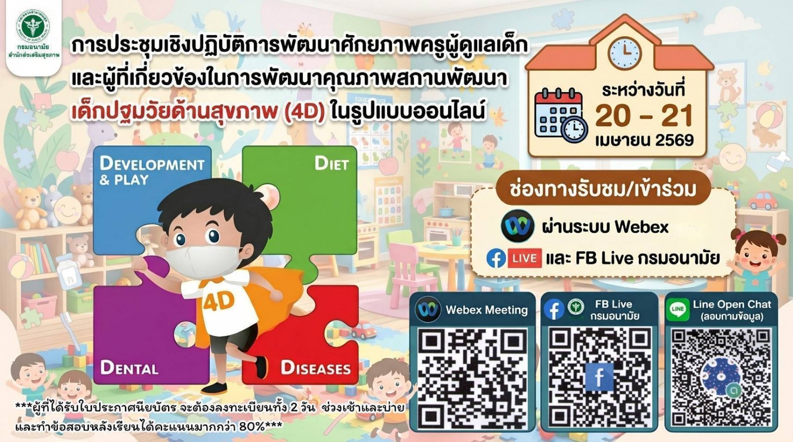 ด้วยกรมอนามัย กระทรวงสาธารณสุข จัดประชุมเชิงปฏิบัติการพัฒนาศักยภาพครูผู้ดูแลเด็กและผู้ที่เกี่ยวข้องในการพัฒนาคุณภาพสถานพัฒนาเด็กปฐมวัยด้านสุขภาพ (4D) ในรูปแบบออนไลน์ ระหว่างวันที่ 20 - 21 เมษายน 2569 ณ ห้องประชุมนรพัฒน์ อาคาร 2 ชั้น 3 สำนักอนามัยการเจริญพันธุ์ กรมอนามัย และผ่านระบบสื่ออิเล็กทรอนิกส์ โดยมีวัตถุประสงค์เพื่อพัฒนาศักยภาพครู ผู้ดูแลเด็กและบุคลากรที่เกี่ยวข้องในการพัฒนาคุณภาพสถานพัฒนาเด็กปฐมวัยและยกระดับการดำเนินงานด้านสุขภาพ (4D) ตามมาตรฐานสถานพัฒนาเด็กปฐมวัยแห่งชาติ