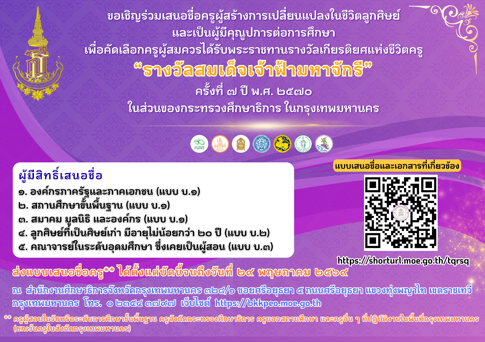 สำนักงานคณะกรรมการส่งเสริมการศึกษาเอกชนพิจารณาแล้วเห็นว่า เพื่อเป็นขวัญและกำลังใจต่อครูโรงเรียนเอกชน จึงขอประชาสัมพันธ์ให้ผู้รับใบอนุญาตโรงเรียนเอกชนในเขตกรุงเทพมหานครทราบ และเสนอชื่อครูผู้มีคุณสมบัติครบถ้วนเข้ารับการพิจารณา โดยส่งเอกสารแบบเสนอชื่อครูพร้อมหนังสือรับรองคุณสมบัติ จำนวน 1 ชุด ได้ที่สำนักงานศึกษาธิการจังหวัดกรุงเทพมหานคร ในวันเวลาราชการและส่งไฟล์เอกสารแบบเสนอชื่อทางไปรษณีย์อิเล็กทรอนิกส์ kiranaa@sueksa.go.th ตั้งแต่บัดนี้จนถึงวันที่ 29 พฤษภาคม 2569 หากพ้นกำหนด จะไม่ได้รับการพิจารณา สามารถศึกษารายละเอียดเพิ่มเติมได้ตาม QR CODE แนบท้ายนี้