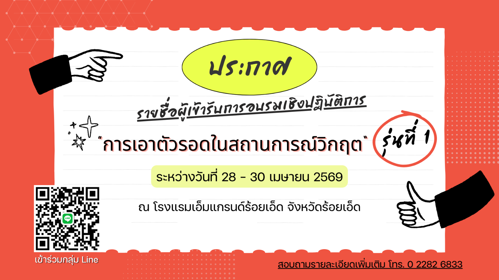 ประกาศรายชื่อการอบรมเชิงปฏิบัติการ “การเอาตัวรอดในสถานการณ์วิกฤต“ รุ่นที่ 1