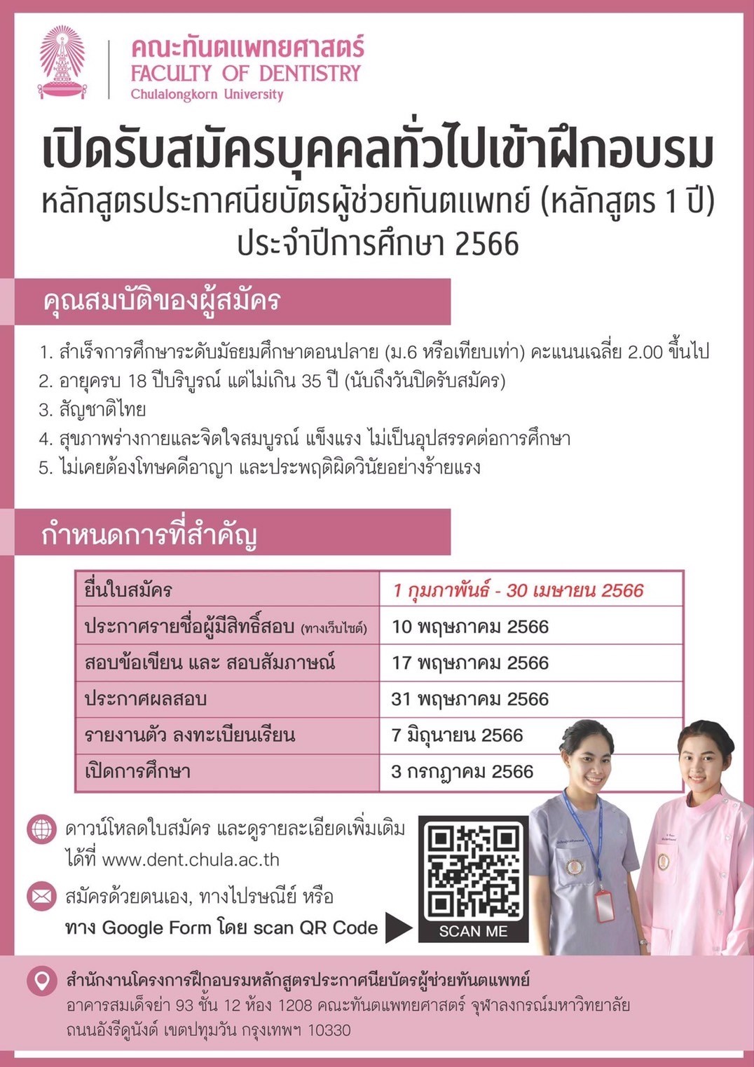 ด้วย หลักสูตรประกาศนียบัตรผู้ช่วยทันตแพทย์ คณะทันตแพทยศาสตร์ จุฬาลงกรณ์มหาวิทยาลัย เปิดรับสมัครนักเรียนเข้าฝึกอบรมหลักสูตรประกาศนียบัตรผู้ช่วยทันตแพทย์ (หลักสูตร 1ปี) ประจำปีการศึกษา 2566 ระหว่างวันที่ 1 กุมภาพันธ์ - 30 เมษายน 2566 ซึ่งในปีการศึกษานี้มีทุนสนับสนุนการศึกษา (แบบมีเงื่อนไข) จำนวน 40 ทุน เพื่อสนับสนุนนักเรียนที่ต้องการศึกษาต่อแต่ขาดแคลนทุนทรัพย์ เรียนจบสามารถปฏิบัติงานที่คณะทันตแพทยศาสตร์ จุฬาลงกรณ์มหาวิทยาลัย ตามเงื่อนไข